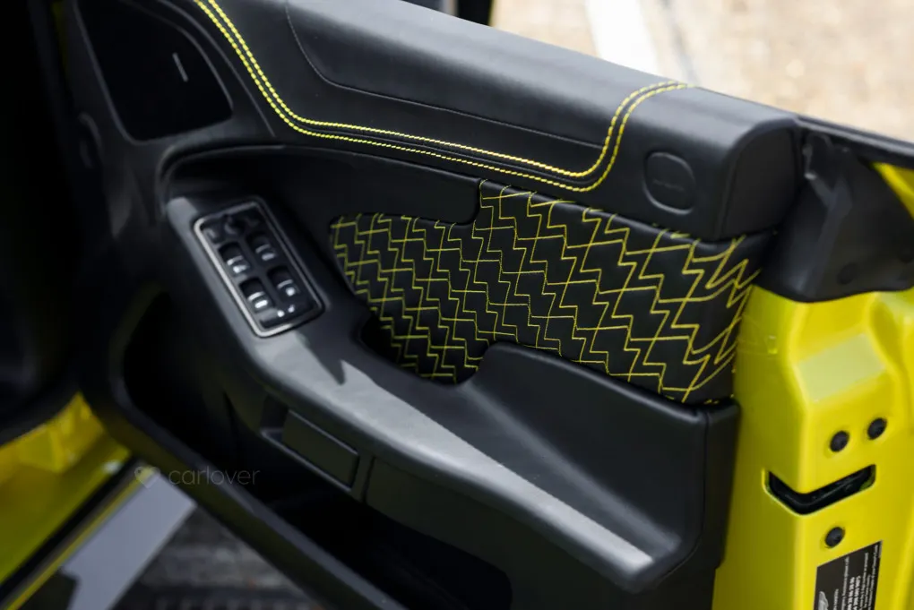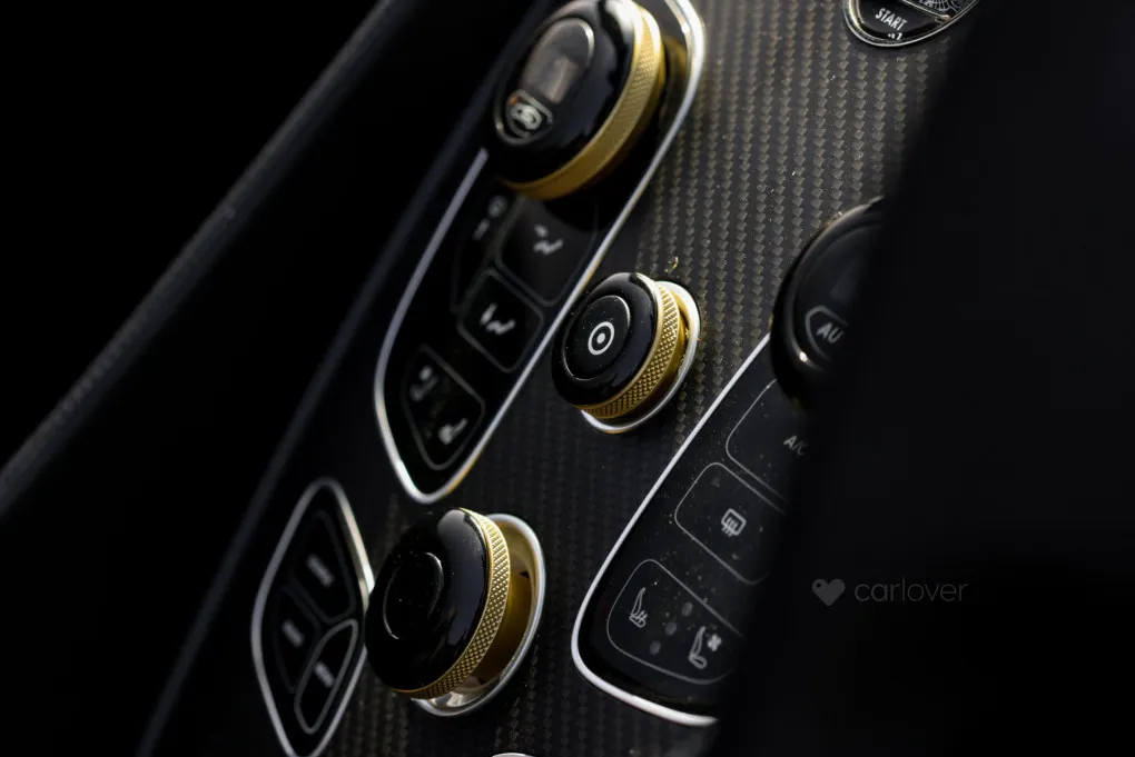 The cars striking presence is defined by its all-carbon-fibre body, featuring larger, seamless panels to eliminate joint lines and amplify its sculptural beauty. Exclusive design elements include a bespoke front grille, side vents, and tail lights inspired by the Aston Martin Vulcan. The door mirrors echo the avant-garde style of the One-77, while a retractable rear spoiler and quad exhaust system nestled within a carbon-fibre diffuser further enhance its dramatic character.
