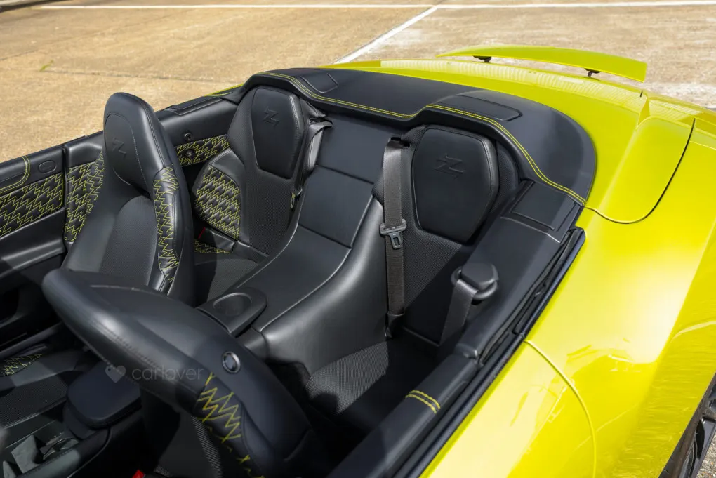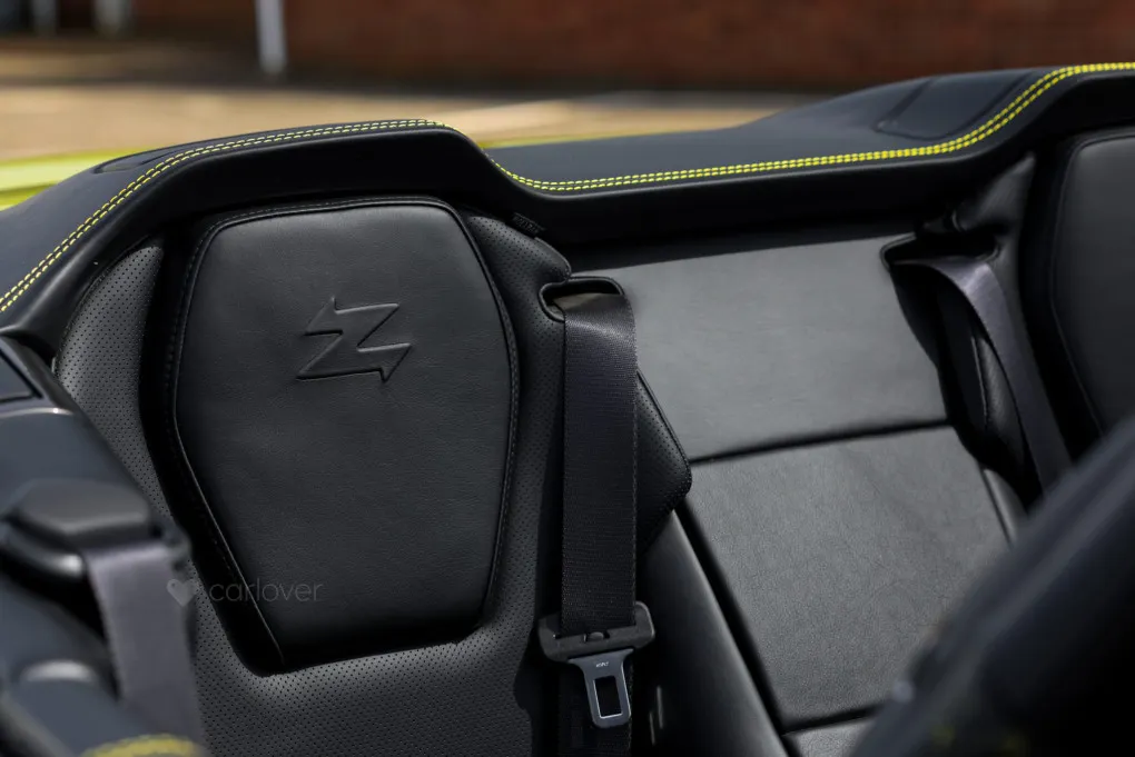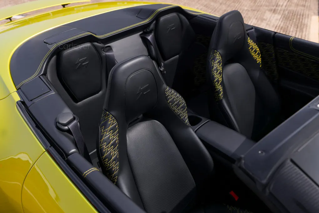 Inside, the bespoke craftsmanship continues with Aston Martin's Q division refining every detail. Highlights include a unique Herringbone Satin Carbon Fibre centre console, anodised bronze accents, and opulent Bridge of Weir leather adorned with the Zagato Z embossing on the headrests. Matching body-colour stitching, a One-77-inspired steering wheel, and meticulous finishing throughout elevate the cabin to unparalleled luxury.
