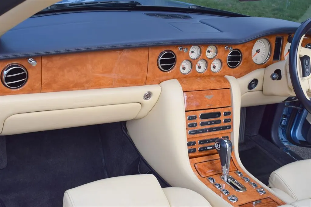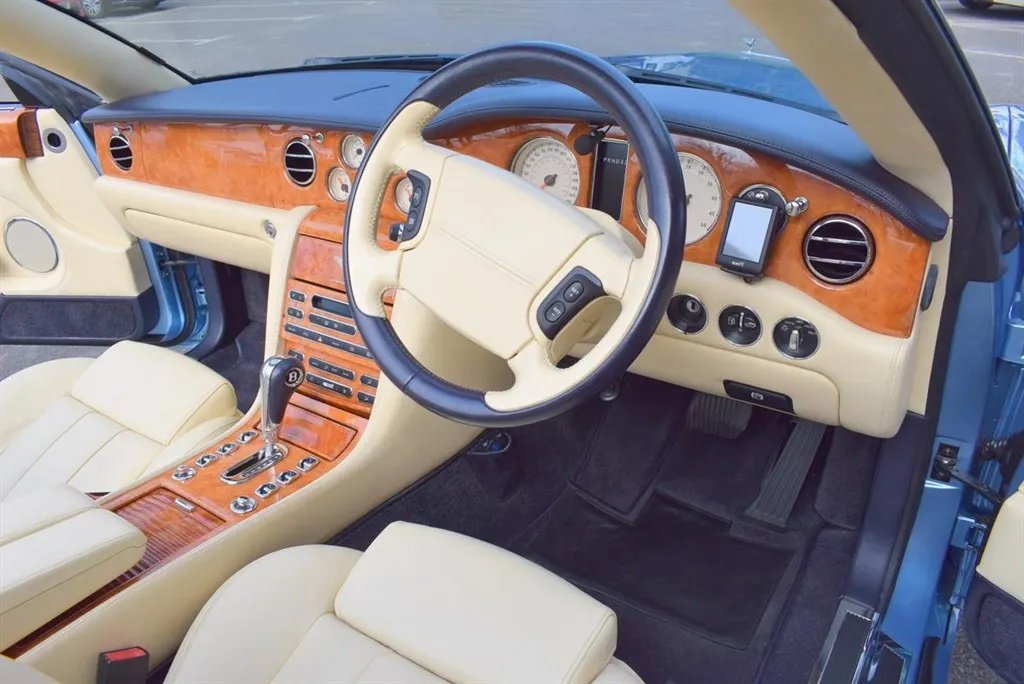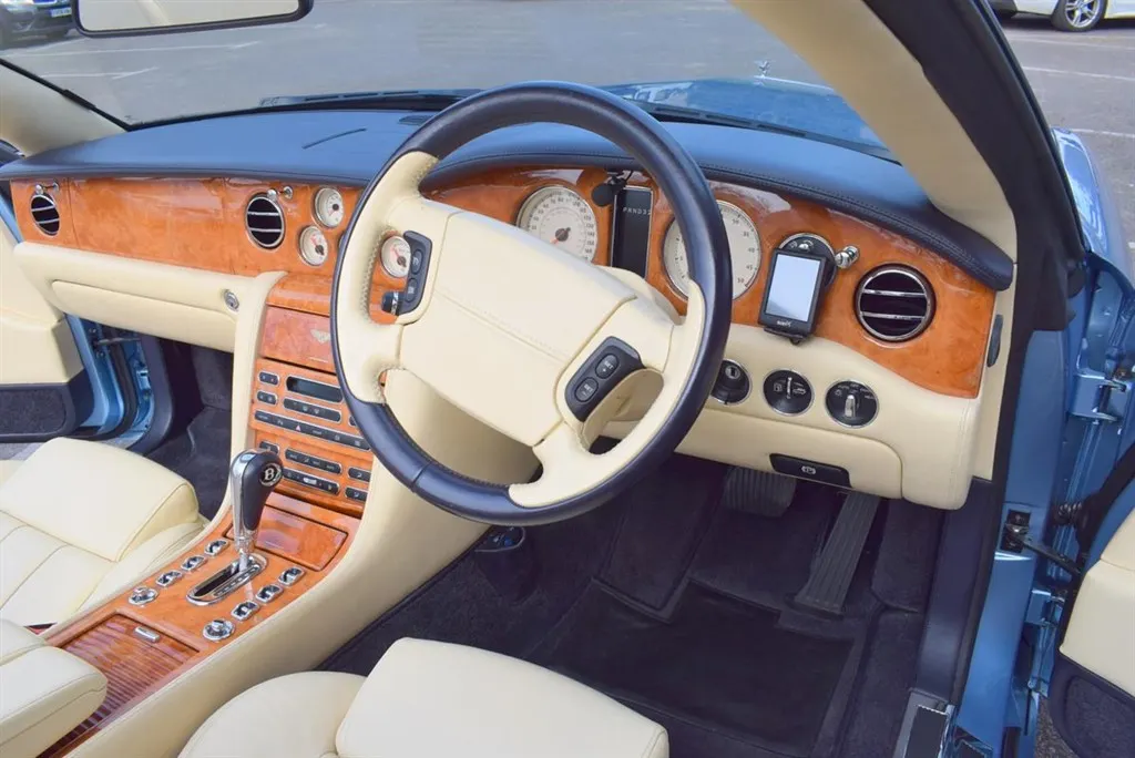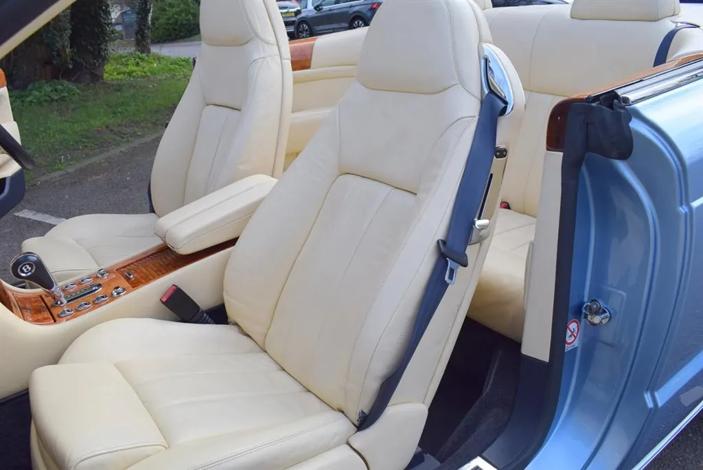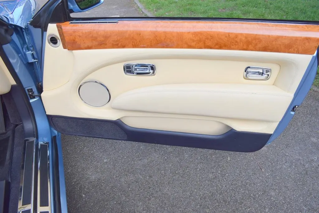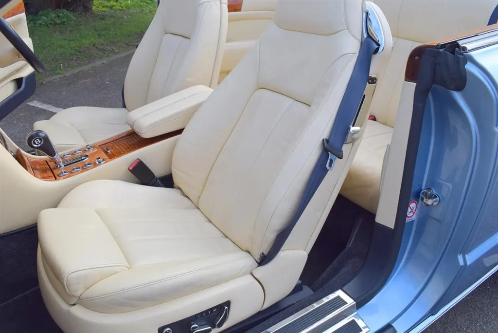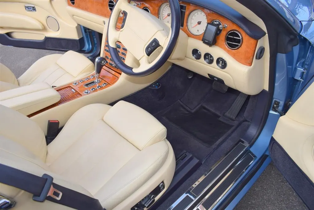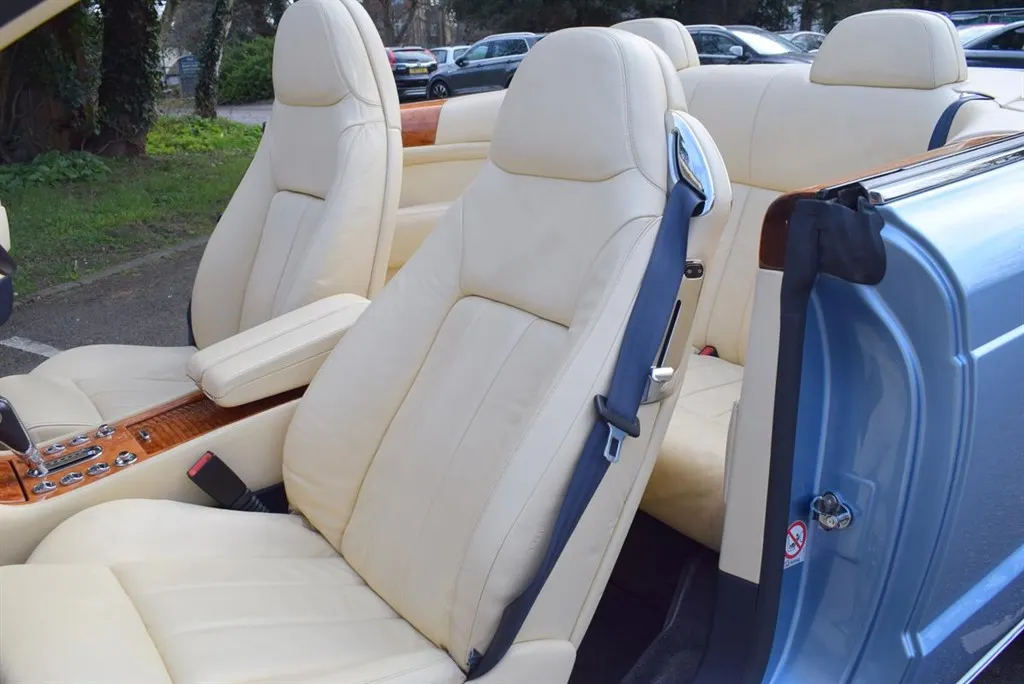 2006/56 Bentley Azure. Finished in unmarked Silverlake with a French Navy mohair hood, Flying B mascot and 19 inch alloys. The interior is in beautiful condition, the leather is perfect, trimmed in Magnolia with Nautic secondary hide, two tone steering wheel and Madrona veneers. Only 39,000 miles with full history and in immaculate condition throughout.