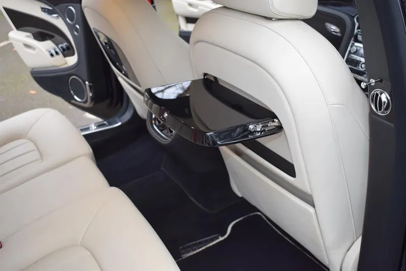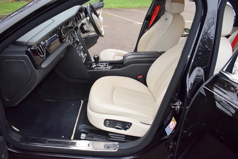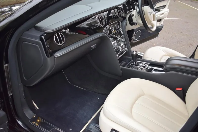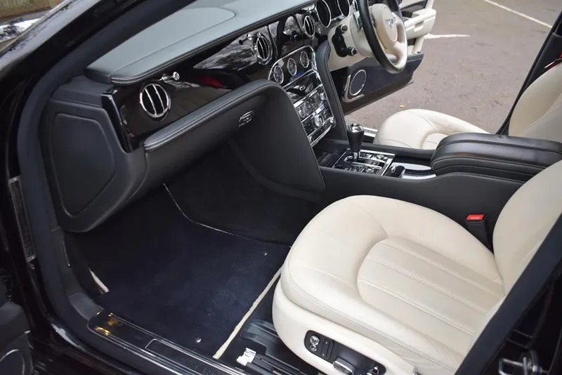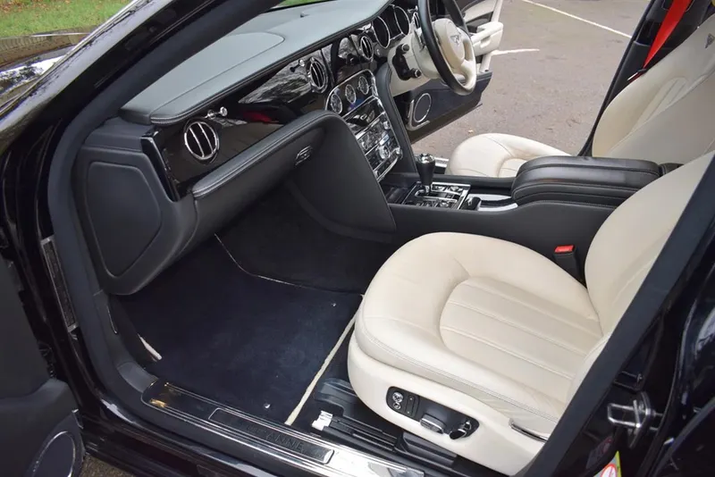 2012/12 Bentley Mulsanne. Finished in Beluga with a fine white coach line. 21 inch five spoke polished alloy wheels. The interior is finished in Linen hide with Beluga secondary hide, with embossed B’s on the headrests and Premier specification, with picnic tables. This car has been maintained regardless of cost by ourselves for the last 8 years. Immaculate condition throughout, outstanding value at £49,995