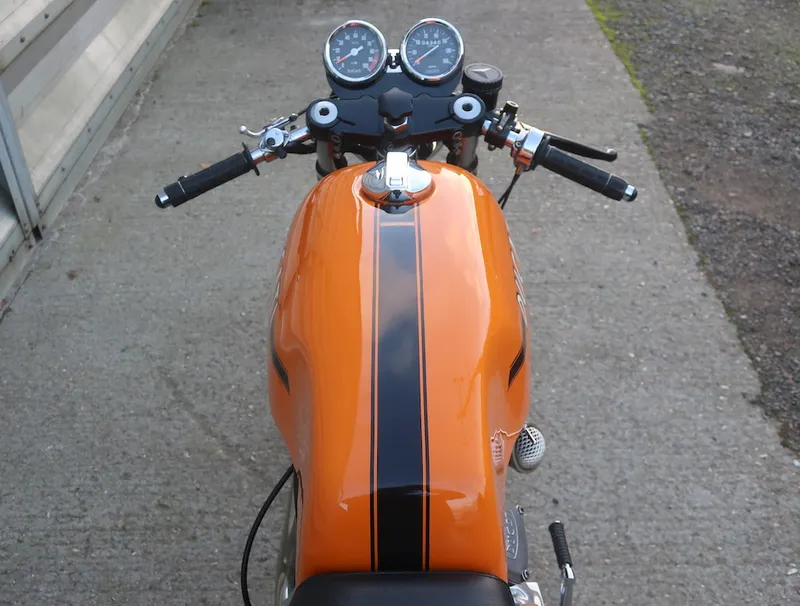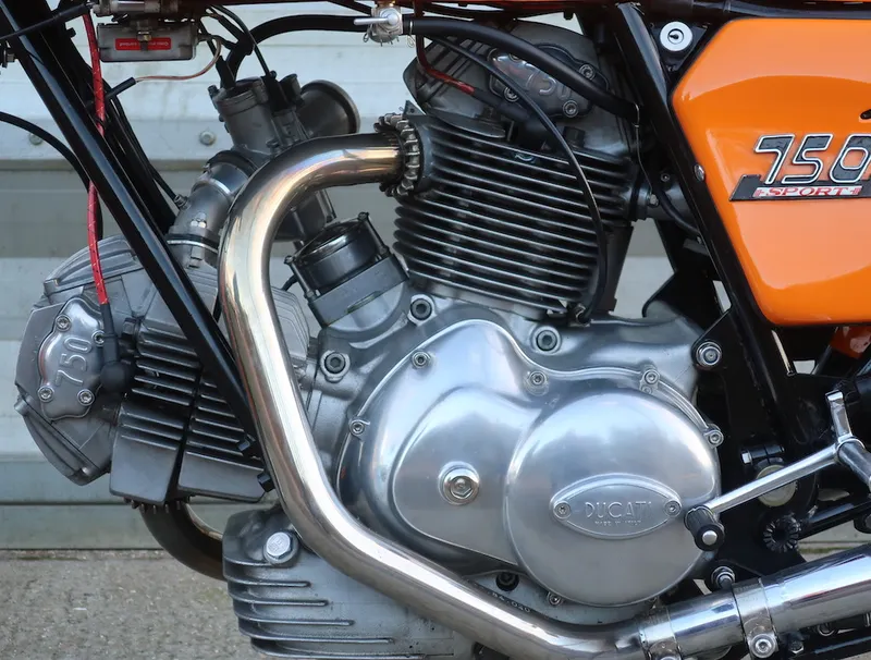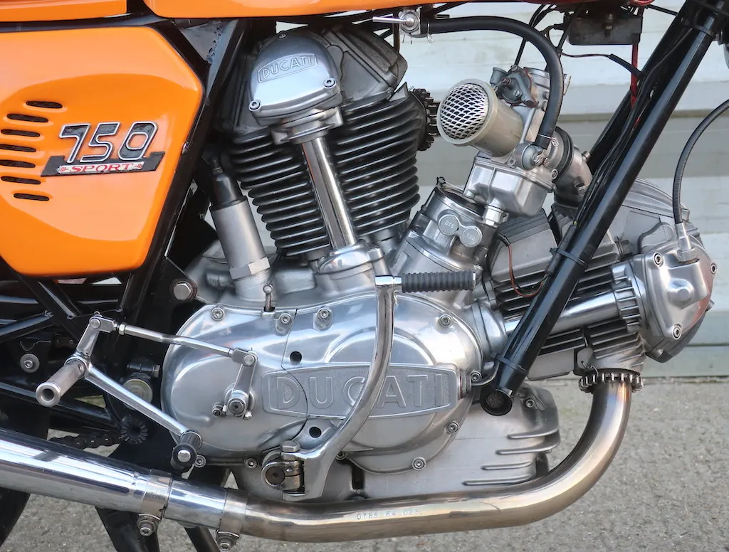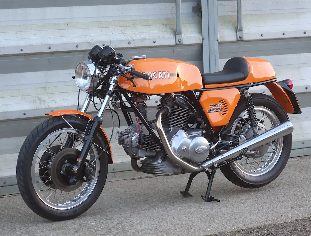 Ducati built the legendary ‘round case’ 750 V Twin, designed by Fabio Taglioni on a relatively small budget, the first road going bike the 750GT arrived in 1971, but It wasn’t until Paul Smart’s Imola race victory in 1972 that the true potential was realised. The 750 Sport road bike followed, a tuned down version of the 750SS ( Green Frame ) race bike it still has the looks and handling of its brother if not quite the same power of the ‘Desmo’ valve race engine. Given that the ‘Green Frame’ bikes are now out of the budget of even the most avid collectors the 750 Sport represents great value and an opportunity to own a proper classic race bred Ducati With only 1,625 bikes being built the prices and availability are sure to rise in coming years. The early history of this example is not known, factory records show the production was late 1972, the bike came to the UK in 2000 and was registered as EKP269K. Not long after this it was restored by marque specialist Paul Klatkiewicz of Ducati Technical Services, the engine received a full rebuild to 775cc with gas flowed cylinder heads and electronic ignition, dyno tested at 64 bhp at the crank and 59 bhp at the rear wheel, new Borrani rims and Conti silencers were also fitted and the bike has covered about 4,500 miles since. Having been in a private collection since 2008 the bike has continued to be maintained well, it remains in excellent condition having won the 2nd prize in the continental category at the Bristol Classic Show in 2019. Sold by us in 2024 we are delighted to be offering this superb motorcycle again. It is supplied with a history file that documents the restoration work in 2000 plus various invoices and a number of old MoT’s, plus a copy of an article in which it featured in The Classic Motorcycle Jan. 2023.