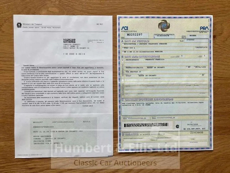 1970 FIAT 500 SOFT TOP - ITALIAN IMPORTMake: FiatModel: 500Registration Plate: Italian Registration MO252297Year of Manufacture: 1970Mileage: 19815Mileage Type: MilesMOT: ValidMOT Expiry: 2026-08-27V5: Will need to be applied forDrive: LHDTransmission: ManualFuel Type: PetrolEngine Size: 6 HPEngine Number: 110F.000Chassis Number: 2706940Interior: RedColour: BlackDoors: 2Seats: 4This vehicle is located in Market Harborough, LE16 from where it will need to be collected.Videos available on request.Viewing is by appointment, please contact the office to arrange. n/a