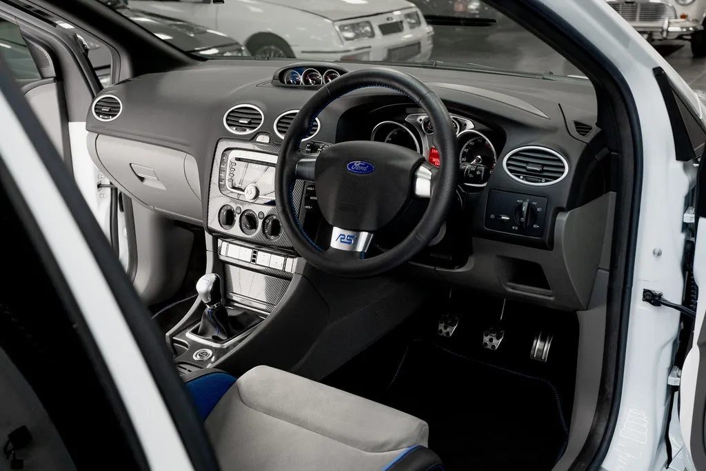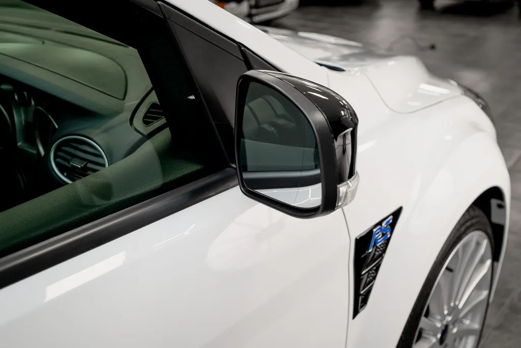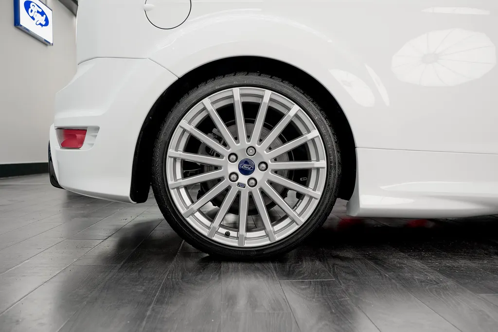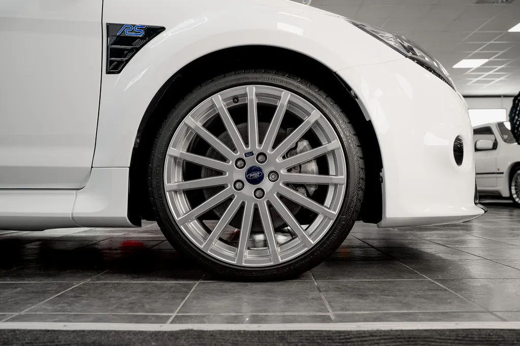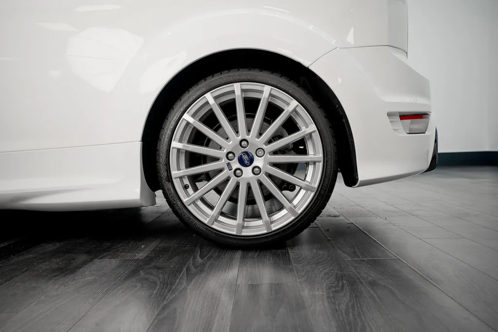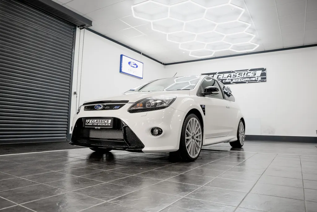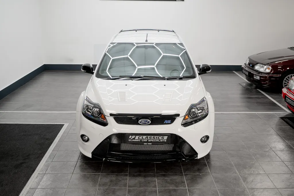 FOR SALE JF CLASSIC CARS are exceptionally proud to offer what is unquestionably one of the finest Mk2 Ford Focus RS examples in existence a 2010 Ford Focus RS in Frozen White, displaying just over 2,400 miles from new This is not simply a used performance Ford…It is a time-warp, investment-grade RS that has lived a life of preservation, provenance and pampered storage. With mileage so low it feels scarcely believable, this RS represents an extraordinarily rare opportunity for the discerning collector, the Ford enthusiast, or the investor seeking one of the most desirable modern performance icons in untouched condition. A true jewel of the RS lineage preserved, cherished, and virtually as-delivered in every respect DESCRIPTION Launched in 2009, the Mk2 Ford Focus RS quickly cemented itself as one of the most iconic high-performance hot hatches ever built. Engineered by Ford Team RS and heavily inspired by the rally-bred RS heritage, the Mk2 RS was designed to deliver explosive performance while retaining everyday usability a combination that made it an instant modern classic EXTERNAL With its motorsport-bred DNA on full display, the Mk2 Ford Focus RS remains one of the most instantly recognisable performance Fords ever built and in Frozen White, this example looks nothing short of breathtaking. Every panel from nose to tail presents with a deep, unbroken gloss, free from chips, blemishes or imperfections, reflecting its scarcely believable mileage and collector-grade preservation. The front end is unmistakably RS a colour-coded bumper incorporating twin black mesh aerodynamic intakes that channel airflow directly where it’s needed, giving both cooling and presence in equal measure. The sculpted bonnet features factory-designed heat-dissipation vents a purposeful motorsport touch that hints at the power lurking beneath. Wide, flared arch extensions give the RS its iconic stance, each one perfectly contoured and absolutely pristine. The Frozen White paintwork contrasts dramatically with the black aerodynamic inserts and vivid blue RS badging, a combination that emphasises the car’s aggression while celebrating its heritage. At the rear, the colour-coded bumper carries a lower black diffuser-style panel housing the dual exhaust outlets which complements the RS’s voice without ensuring originality. Above it all sits the unmistakable twin-blade rear spoiler functional, stable, and visually dominant without being overbearing, keeping the chassis planted at speed and reminding you this car was engineered with performance at its core. All RS emblems remain perfectly positioned and factory-fresh, while the original glazing is retained throughout, with the rear windows finished in Ford’s correct factory tint. Window rubbers are supple, unworn, and free from the common ageing seen on lesser-used examples. Power-folding, colour-coded door mirrors with black backing panels complete the exterior, incorporating factory puddle lamps and indicator repeaters all functioning exactly as they should. The entire exterior presentation is nothing short of exceptional a time-warp RS whose condition, originality and visual impact place it firmly among the finest Mk2 examples available today INTERNAL Opening either door instantly confirms that this Focus RS is far more than a performance hatch it is a preserved piece of modern Ford iconography. The cabin looks, feels, and even smells like a car that has been cherished from the moment it left the showroom. You are first greeted by the extraordinary Recaro Race Bucket seats, their deep bolsters finished in black and blue with immaculate grey Alcantara centre sections. The iconic Recaro and RS emblems, detailed with blue stitching, remain bright and unworn. Both front seats present virtually as new, with no softness to the bolsters, no sheen to the Alcantara and not even the faintest suggestion of use. The rear bucket-style seats match the fronts in design and condition tight, clean, and showroom fresh. The door cards continue the theme of quality and design, upholstered in grey and black with a precise blue-stitched horizontal detail. They remain free from scuffs, marks or distortion. The deep-pile carpets running throughout the cabin look untouched, retaining a richness of colour and texture that instantly gives away the incredibly low mileage. Sitting behind the wheel, the driver is met with a perfectly preserved black leather steering wheel with blue stitching, the leather still matte and unworn. Centre stage, the smoked carbon-effect console frames the start button, a signature RS detail and one that contributes to the sense of theatre every time the engine is awakened. Every switch, dial and control operates precisely as Ford intended. All warning lights perform their checks and extinguish correctly, and there is not a single worn or shiny button to be found. The silver gear knob and matching handbrake lever remain pristine with zero wear something almost unheard of on most Mk2 RS models. Covering just over 2,400 miles from new, this interior is a masterclass in preservation. It feels original, untouched, and remarkably tight throughout a cabin that speaks volumes about careful ownership, dry storage, and meticulous attention to detail. In short, the interior is nothing less than stunning a genuine museum-grade example of the Mk2 Focus RS, presenting exactly as a collector would hope but very rarely ever find. ENGINE & TRANSMISSION Lifting the bonnet reveals an engine bay that is nothing short of exemplary factory-correct, beautifully preserved, and remarkably clean throughout. This is exactly how a true low-mileage collector-grade Focus RS should present. At its heart lies Ford’s legendary 2.5-litre turbocharged five-cylinder Duratec engine, a powerplant that helped define the modern hot-hatch era. In RS specification, it delivers an impressive 305 PS (224 kW) at 6,000 rpm along with a muscular 440 Nm (325 lb-ft) of torque available from just 2,250