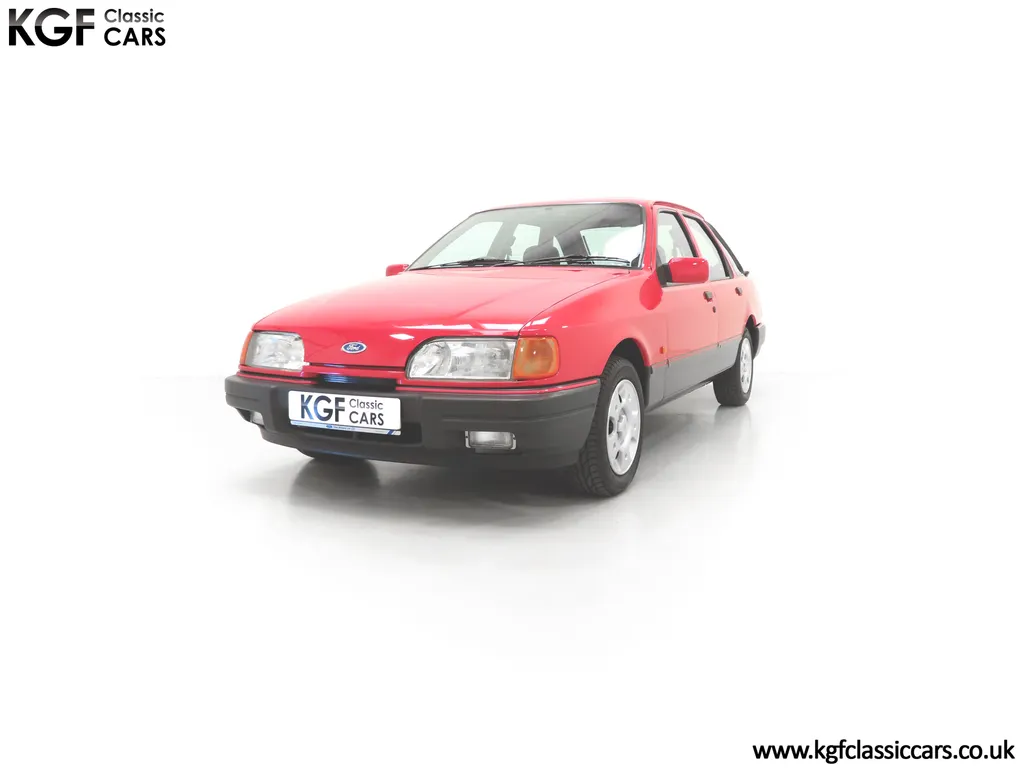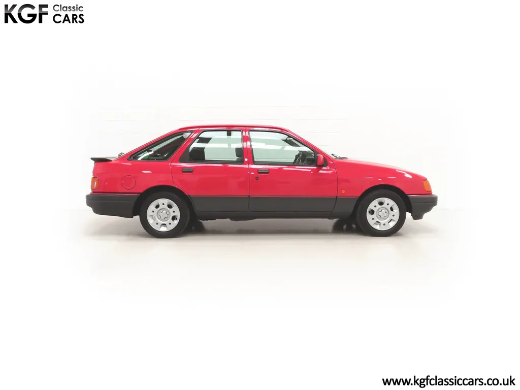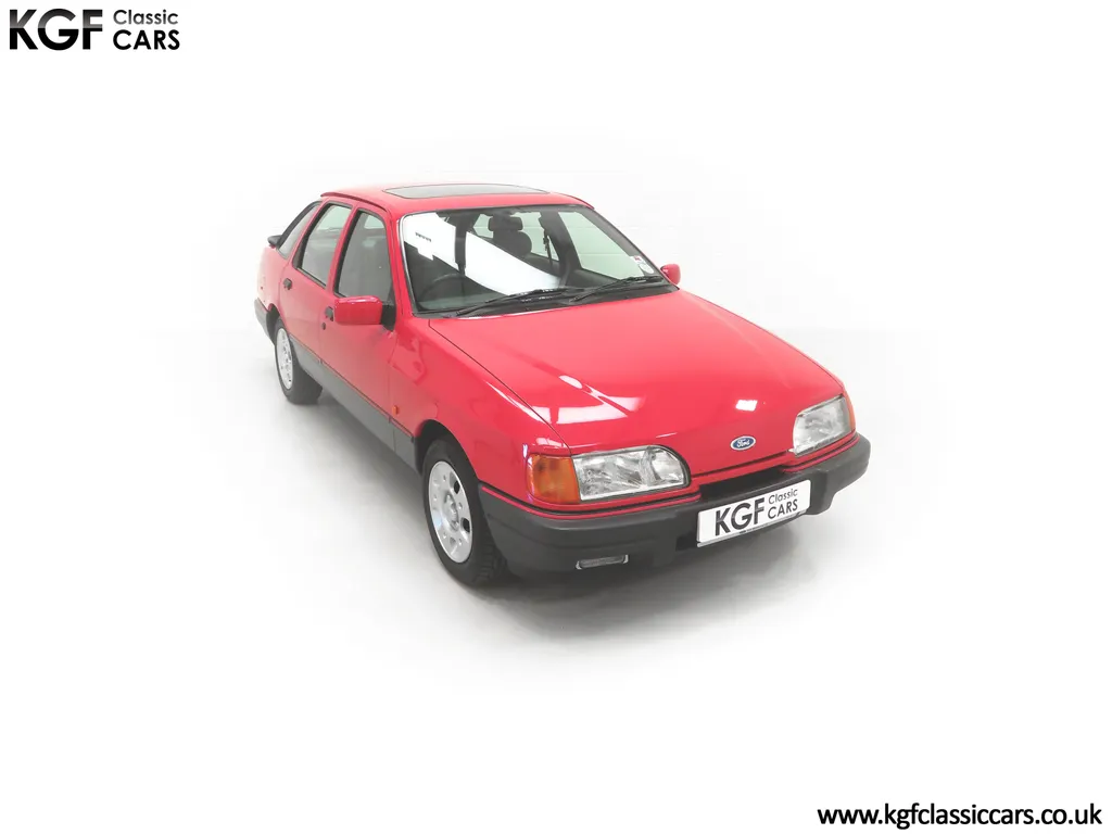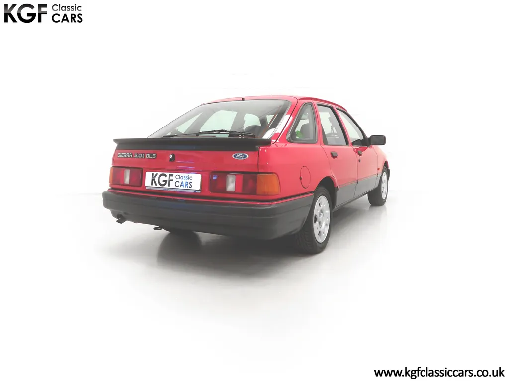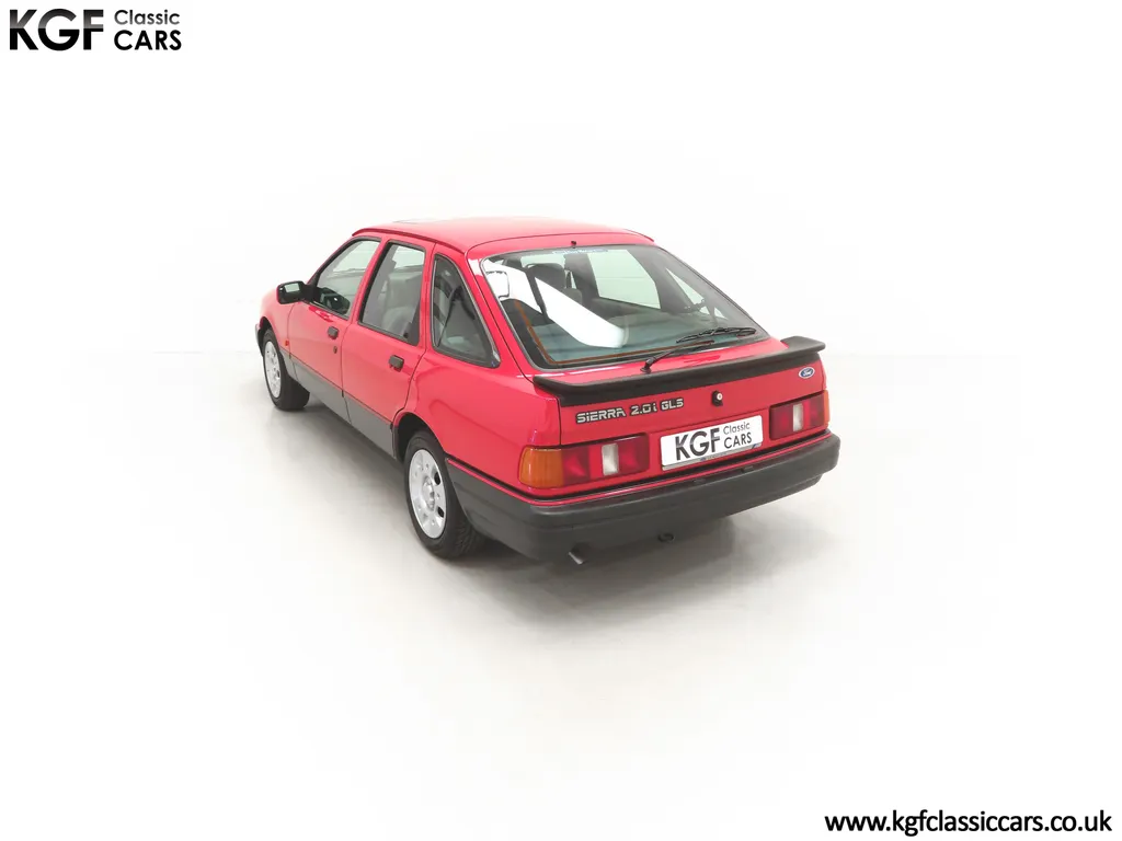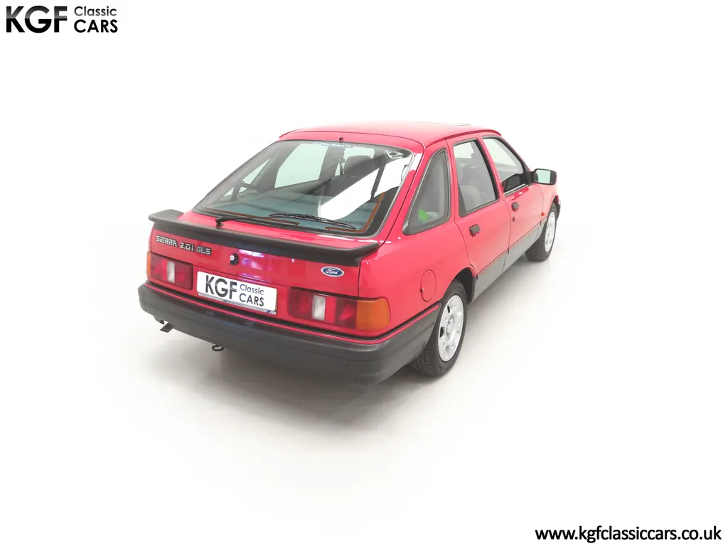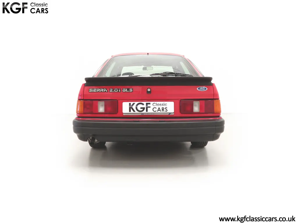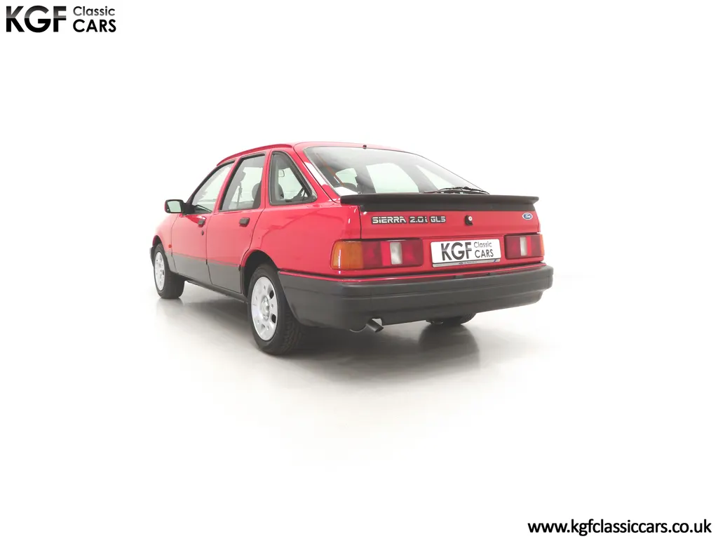 FOR SALE A spectacular original Ford Sierra 2.0i GLS with just 49,196 miles from new. EQUIPMENT Fully independent sports suspension, unique GLS wheel covers, Black tailgate spoiler, Cobra red inserts to bumpers and bodyside mouldings, Mid-grey treatment below bodyside mouldings, colour coded remote control heated door mirrors, halogen headlamps, integral front fog lamps, tilt/slide screened glass sunroof, digital clock, tachometer, central locking, electric front windows, Ford ESRT32PS FM radio cassette. Dealer Options: Tailored Ford carpet mats. EXTERIOR The Ford Rosso Red paintwork, (Code R 5) has a stunning deep glossy shine and the correct Mid Grey paintwork to the lower sections of the car remains exactly as Ford intended. Close scrutiny reveals noting other than a few frontal stone chips and markings, utterly insignificant and forgiven considering the originality. Garaged from new, the body panels are factory fitment and often prone weak areas such as wheel arches and sills are amazing and have never been repaired. The underside is absolutely original, unmolested and structural integrity is perfect with even factory stamps to suspension component still visible. Factory etched glass, genuine Ford lenses throughout, Carello headlamps and supplying dealer number plates and rear screen sticker all present. INTERIOR The Strobe trim in Shadow Grey colour scheme, (Code LD), is spotlessly clean and the seats have firm bolsters and bases retaining correct shape. There is a small seam repair to the driver’s seat and the door cards have slight shrinkage to the fabric, a common occurrence. A small nick to the driver’s door card is visible. The colour-keyed velour carpet is immaculate and free from wear and the neutral tone headlining is perfect. The pristine dashboard has no cracks, distortion or fading. All switchgear and equipment operates perfectly, as does the original Ford ESRT32PS radio with joystick control. The immaculate luggage area has unmarked carpeting, an undamaged circular ply-board wheel cover, Ford jack and factory build sticker to the pristine boot floor. ENGINE & TRANSMISSION The 2.0 EFi engine developing 118bhp and 160Nm of torque, achieving a top speed of 118mph and 0-60mph in 9.3 seconds. Lifting the bonnet reveals a beautifully clean engine bay, completely standard and unmolested. The VIN and data plates and original stickers and labels remain. Factory fitted wings show clearly defined Ford emblem and date stamps owing to first paint credentials, as does the slam panel with factory seam sealer. Genuine Motorcraft service items and consumables are plentiful. The engine breathes through a completely standard genuine Ford exhaust system and the car runs and performs beautifully. The five-speed Type-9 gearbox is light and precise. WHEELS, TYRES & BRAKES The 14” X 5½” steel wheels wear the correct pristine GLS trims. Matching replacement premium Uniroyal 195/60 R14 tyres have plenty of tread and the spare wheel wears the original 1988 Uniroyal Rallye tyre, unused and still with coloured banding! The dual line servo assisted G-Valve brakes with ventilated 10.5” front discs and rear drums operate perfectly having enjoyed conscientious maintenance. HISTORY FILE This Sierra has been owned by Steve, Operations Manager at KGF Classic Cars, for the last seven years. Over the years, the car has appeared on our social media channels. The car was supplied new by Ford Main Dealer, Doe Motors of Maldon in Essex, and registered new on the 18th April 1988. The first owner, Mr Gillman, owned the car for around a year when in 1989 it returned to the supplying dealer to be sold again. The used vehicle order form and sales invoice from Doe Motors made out to second owner, Mr Cameron, is in the history file. The car was put into dry storage in around the year 2000 following the owner passing and his wife feeling unable to part with her late husband’s car. It was only in 2018 and upon Mrs Cameron’s passing that the car was discovered with just over 40,000 miles on the clock. At this point, KGF Classic Cars were offered the car and upon its arrival, Steve insisted it was not to be put on sale, because he was having it! After full recommissioning, the car was used regularly in dry weather and has been thoroughly enjoyed for the last seven years. The car was also displayed at the 40th anniversary celebration at the Ford of Britain Dunton Campus. A major service was carried out in March 2025 and cambelt renewal in September 2025. The original Doe Motors document wallet houses the service book with 11 stamped entries, handbooks, guides and dealership literature as well as two keys. A large history folder holds many invoices and receipts for servicing as well as all MOT certificates since the first in 1991 to 2000 when the car went into storage. All further MOT certificates and service invoices from 2018 to present fully verify the 49,196 miles from new. MOT October 2026, HPI Clear.