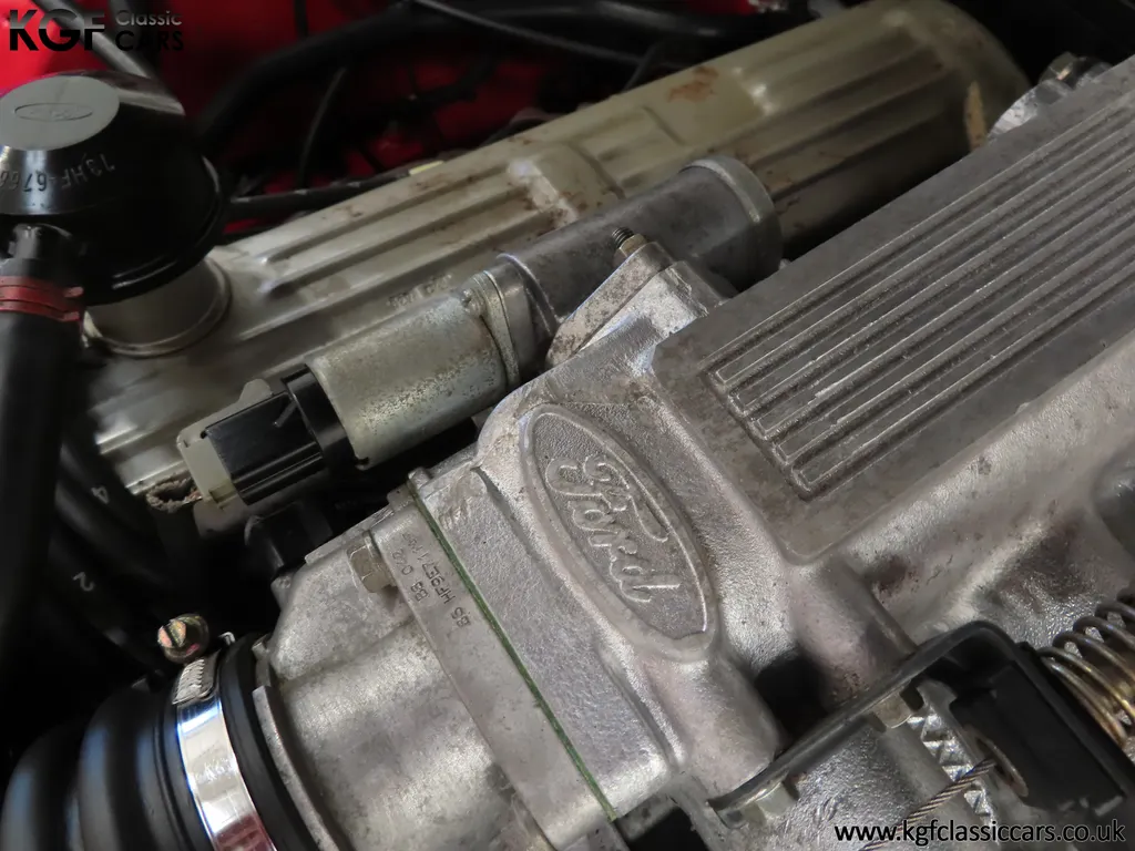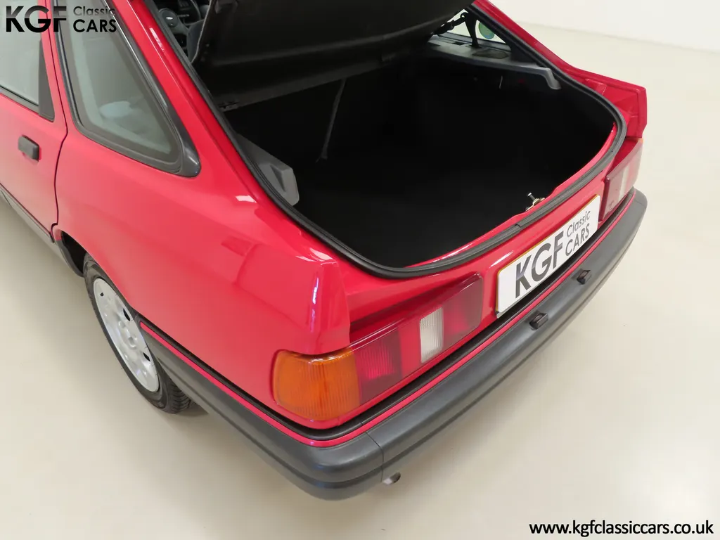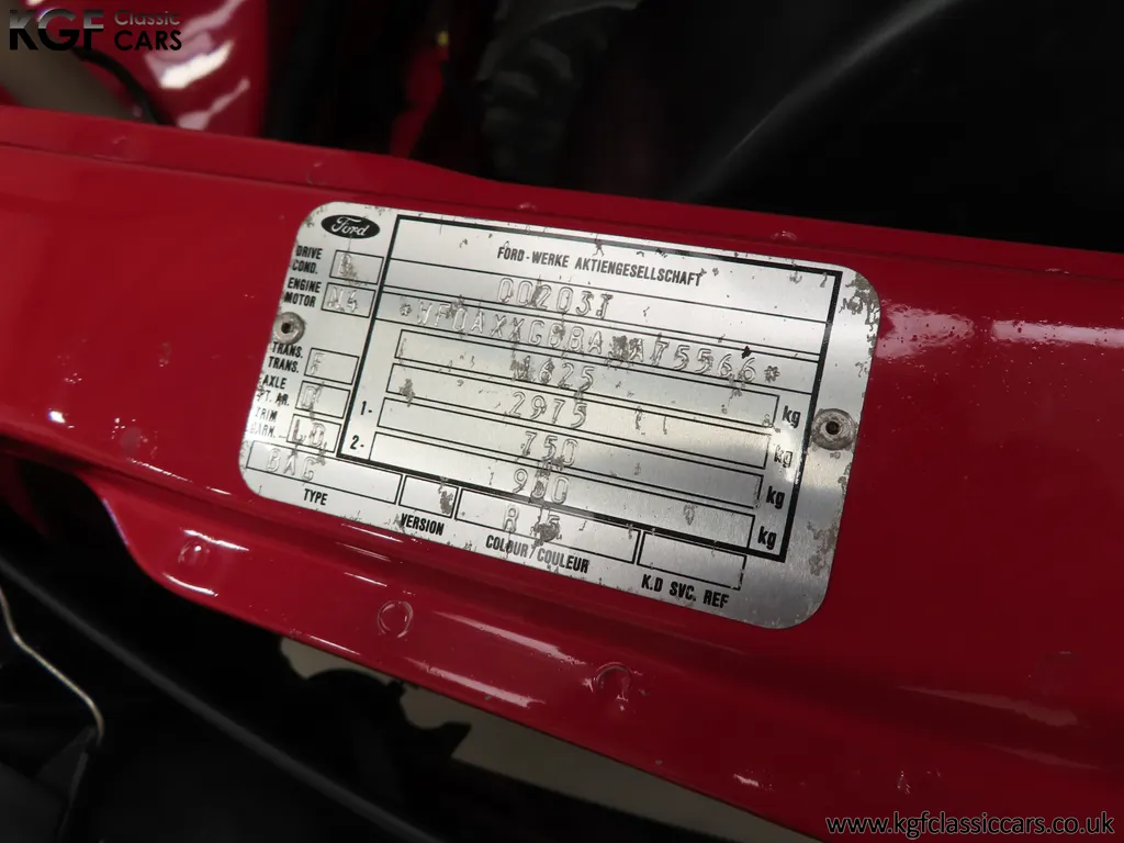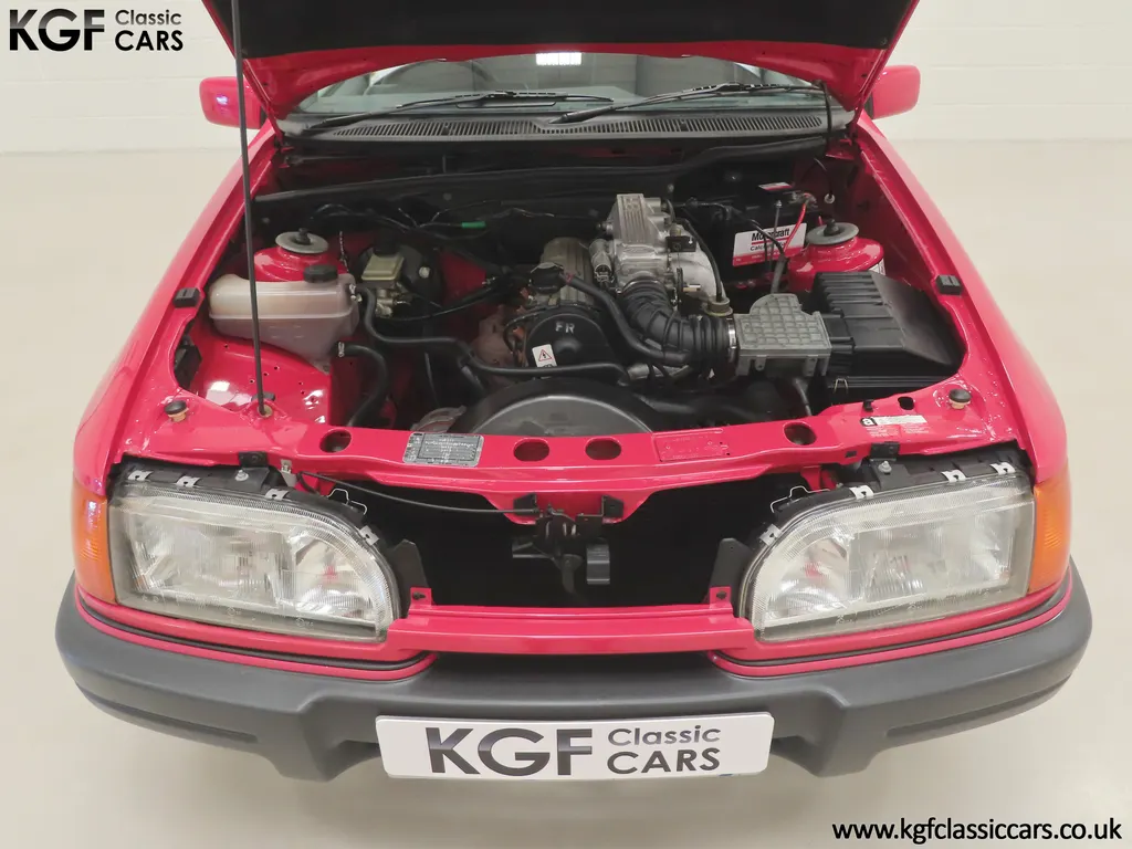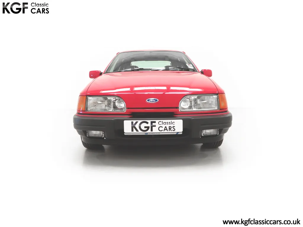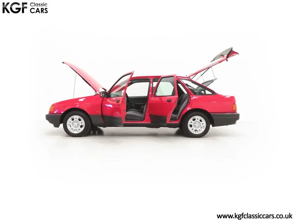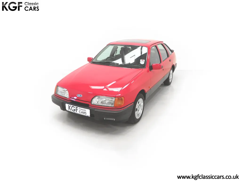 FOR SALE A spectacular original Ford Sierra 2.0i GLS with just 49,196 miles from new. EQUIPMENT Fully independent sports suspension, unique GLS wheel covers, Black tailgate spoiler, Cobra red inserts to bumpers and bodyside mouldings, Mid-grey treatment below bodyside mouldings, colour coded remote control heated door mirrors, halogen headlamps, integral front fog lamps, tilt/slide screened glass sunroof, digital clock, tachometer, central locking, electric front windows, Ford ESRT32PS FM radio cassette. Dealer Options: Tailored Ford carpet mats. EXTERIOR The Ford Rosso Red paintwork, (Code R 5) has a stunning deep glossy shine and the correct Mid Grey paintwork to the lower sections of the car remains exactly as Ford intended. Close scrutiny reveals noting other than a few frontal stone chips and markings, utterly insignificant and forgiven considering the originality. Garaged from new, the body panels are factory fitment and often prone weak areas such as wheel arches and sills are amazing and have never been repaired. The underside is absolutely original, unmolested and structural integrity is perfect with even factory stamps to suspension component still visible. Factory etched glass, genuine Ford lenses throughout, Carello headlamps and supplying dealer number plates and rear screen sticker all present. INTERIOR The Strobe trim in Shadow Grey colour scheme, (Code LD), is spotlessly clean and the seats have firm bolsters and bases retaining correct shape. There is a small seam repair to the driver’s seat and the door cards have slight shrinkage to the fabric, a common occurrence. A small nick to the driver’s door card is visible. The colour-keyed velour carpet is immaculate and free from wear and the neutral tone headlining is perfect. The pristine dashboard has no cracks, distortion or fading. All switchgear and equipment operates perfectly, as does the original Ford ESRT32PS radio with joystick control. The immaculate luggage area has unmarked carpeting, an undamaged circular ply-board wheel cover, Ford jack and factory build sticker to the pristine boot floor. ENGINE & TRANSMISSION The 2.0 EFi engine developing 118bhp and 160Nm of torque, achieving a top speed of 118mph and 0-60mph in 9.3 seconds. Lifting the bonnet reveals a beautifully clean engine bay, completely standard and unmolested. The VIN and data plates and original stickers and labels remain. Factory fitted wings show clearly defined Ford emblem and date stamps owing to first paint credentials, as does the slam panel with factory seam sealer. Genuine Motorcraft service items and consumables are plentiful. The engine breathes through a completely standard genuine Ford exhaust system and the car runs and performs beautifully. The five-speed Type-9 gearbox is light and precise. WHEELS, TYRES & BRAKES The 14” X 5½” steel wheels wear the correct pristine GLS trims. Matching replacement premium Uniroyal 195/60 R14 tyres have plenty of tread and the spare wheel wears the original 1988 Uniroyal Rallye tyre, unused and still with coloured banding! The dual line servo assisted G-Valve brakes with ventilated 10.5” front discs and rear drums operate perfectly having enjoyed conscientious maintenance. HISTORY FILE This Sierra has been owned by Steve, Operations Manager at KGF Classic Cars, for the last seven years. Over the years, the car has appeared on our social media channels. The car was supplied new by Ford Main Dealer, Doe Motors of Maldon in Essex, and registered new on the 18th April 1988. The first owner, Mr Gillman, owned the car for around a year when in 1989 it returned to the supplying dealer to be sold again. The used vehicle order form and sales invoice from Doe Motors made out to second owner, Mr Cameron, is in the history file. The car was put into dry storage in around the year 2000 following the owner passing and his wife feeling unable to part with her late husband’s car. It was only in 2018 and upon Mrs Cameron’s passing that the car was discovered with just over 40,000 miles on the clock. At this point, KGF Classic Cars were offered the car and upon its arrival, Steve insisted it was not to be put on sale, because he was having it! After full recommissioning, the car was used regularly in dry weather and has been thoroughly enjoyed for the last seven years. The car was also displayed at the 40th anniversary celebration at the Ford of Britain Dunton Campus. A major service was carried out in March 2025 and cambelt renewal in September 2025. The original Doe Motors document wallet houses the service book with 11 stamped entries, handbooks, guides and dealership literature as well as two keys. A large history folder holds many invoices and receipts for servicing as well as all MOT certificates since the first in 1991 to 2000 when the car went into storage. All further MOT certificates and service invoices from 2018 to present fully verify the 49,196 miles from new. MOT October 2026, HPI Clear.