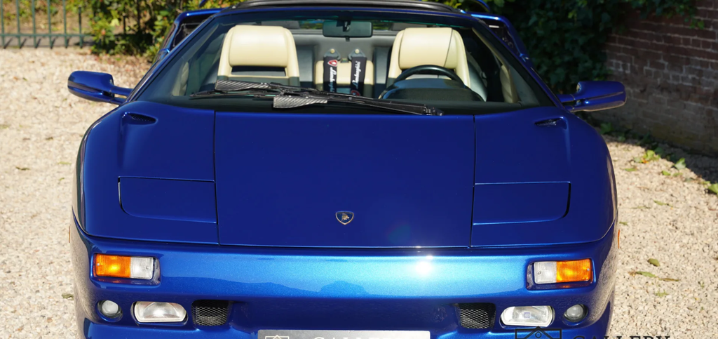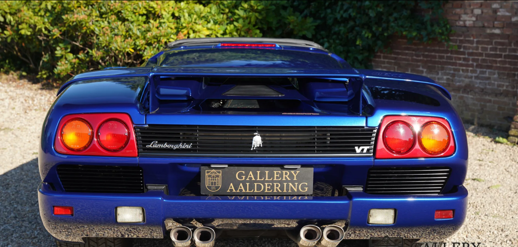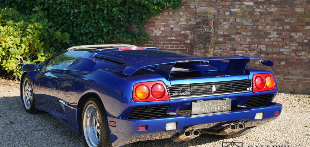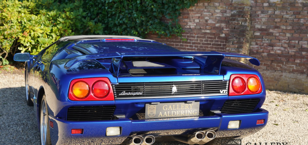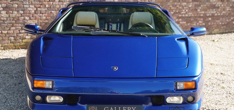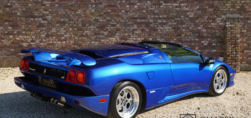 It was 1990 when the world became acquainted with the new model from Sant’Agata, as the successor to the then sixteen-year-old Countach. In 1987, the development of the model starts to get going, when Chrysler takes over the company for a sloppy $ 25 million. Marcello Gandini had already had an idea ready for some time, called Project 132, but Chrysler thought it was already too dated and too sharp at the time and pushed Gandini to the background. Chrysler’s own Tom Gale of the Chrysler Styling Center is allowed to revive the project to come up with a smoother and more subdued version of Gandini’s project. In 1990 the Diablo is ready to be shown to the public during the second Lamborghini Day at the Hotel de Paris in Monte Carlo. The pop-up headlights, the upward-hinged doors and the extremely thick rear part lower the lower jaw of everyone present, followed by applause. Under the long tailgate is a 5.7 liter V12 with two overhead camshafts, four valves per cylinder and a simple computer-controlled multipoint petrol injection. Ability? An incredible 492 hp plus 580 Nm of torque at the time. With this, the Lambo, weighing 1,576 kilograms, races to 100 in 4.5 seconds. It is the brand’s first car to pass the magical 200-mph mark. Only at 202 miles per hour, or 325 km/h, is the porridge finished. You don’t need to scroll through the option list forever. Standard are fully adjustable seats and steering wheel, power windows, an Alpine radio (who needs that in a Diablo?!) and power steering from 1993. Right, the first three years it comes down to muscular arms. In 1993, the Diablo VT, which stands for Viscous Traction, Lamborghini’s four-wheel drive system, also appears. In 1995, the open version of the Diablo, the Roadster VT, appeared, of which only about 200 were built. That is the variant we offer here, delivered on February 28, 1996 in America and received a Dutch registration in 2012. Despite its height of only 1.10 meters, you cannot overlook the supercar: bright blue metallic paint, an interior made of beige leather with many carbon parts: an absolute attention-grabber, this Diablo. The body is beautiful, the paint in very good condition. In a word, the Lamborghini looks great, even more striking because of the original chrome-plated multi-part wheels. What an impressive car it is. Built at a time when pedestrian concessions, following an ‘average taste of the target group’ was not yet seen as leading. No, an extremely designed car as it should be in Lamborghini’s eyes. The interior is also completely uncompromising. The wide center tunnel, the large dome behind the wheel that accommodates all the important instruments. The small, almost anonymous steering wheel, inviting you to grip very tightly as the huge V12 is allowed to show what it is capable of. Everything radiates that this car is capable of majestic performances. At the same time, the car also radiates that it has always been cherished. Beige leather upholstery can quickly start to look used, but with this Diablo everything is still in beautiful condition. If there is anything important when purchasing a Diablo, it is the state of the technology. Well, with this Lamborghini you don’t have to worry about that. In the past year and a half, the Roadster VT underwent a complete technical restoration at the official dealer. Invoices accompanying the car show that more than € 100,000 has been invested to get the car back in formidable condition. That restoration included everything that actually comes to light with a car of this age when looking in detail at what could be improved. The result is astonishing, a Diablo Roadster VT that is actually in mint condition, in a beautiful color scheme. A beloved open version that is ready for a new chapter in its exciting boy’s book. This boys’ book comes complete with invoices, original booklets, in the original suede folder. You will probably not find a better copy. Gallery Aaldering is Europe’s leading Classic Cars specialist since 1975! Always 400 Classic and Sportscars in stock, please visit www.gallery-aaldering.com for the current stock list (all offered cars are available in our showroom) and further information. We are located near the German border, 95 km from Düsseldorf and 90 km from Amsterdam. So easy traveling by plane, train, taxi and car. Transport and worldwide shipping can be arranged. No duties/import costs within Europe. We buy, sell and provide consignment sales (selling on behalf of the owner). We can arrange/provide registration/papers for our German (H-Kennzeichen, TÜV, Fahrzeugbrief, Wertgutachten usw.) and Benelux customers. Gallery Aaldering, Arnhemsestraat 47, 6971 AP Brummen, The Netherlands. Tel: 0031-575-564055. Quality, experience and transparency is what sets us apart. We look forward to welcoming you in our showroom.