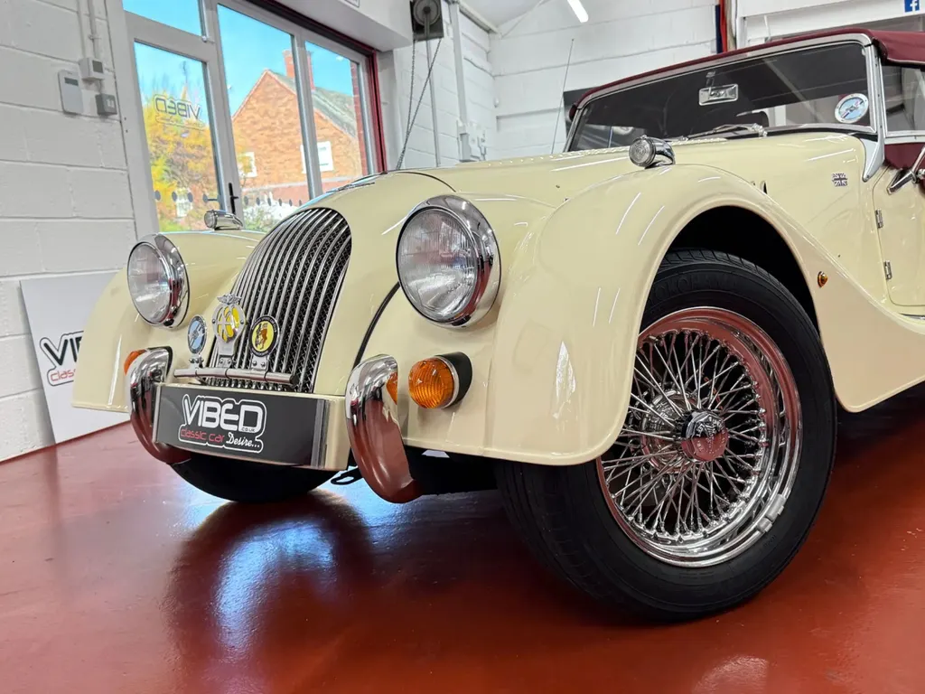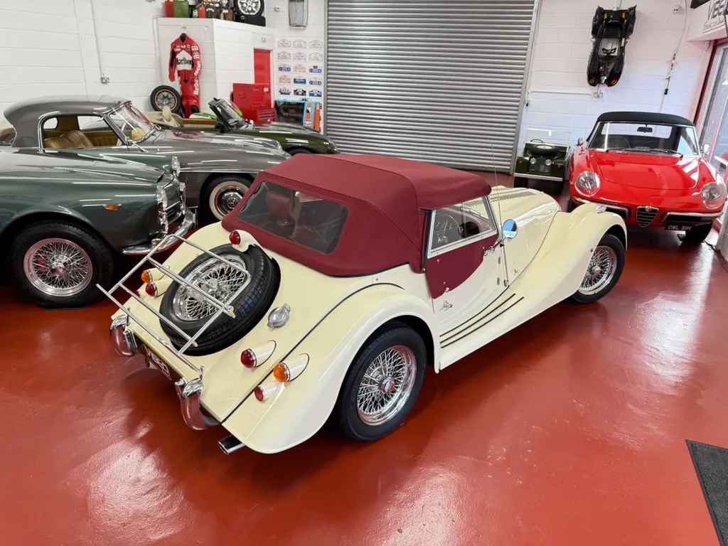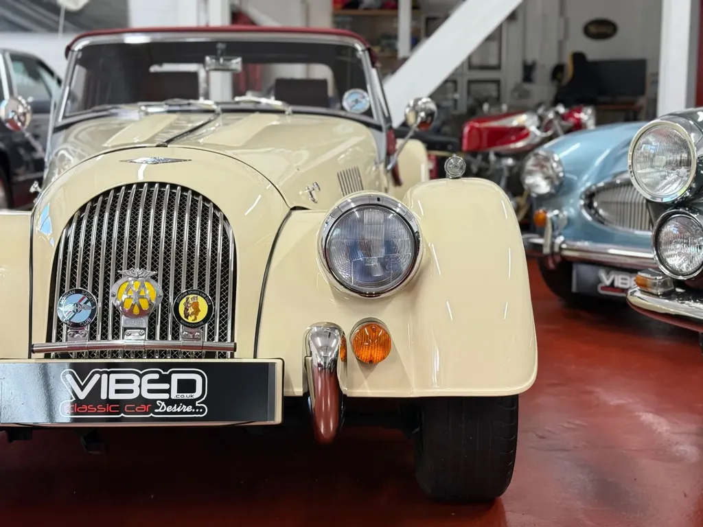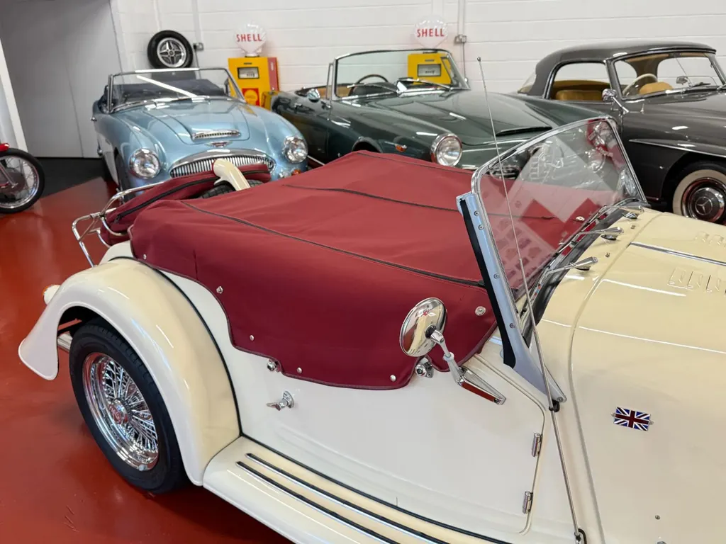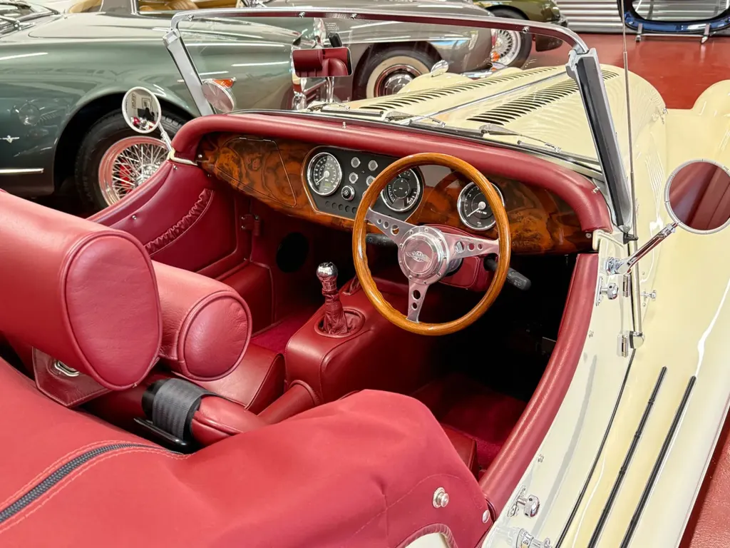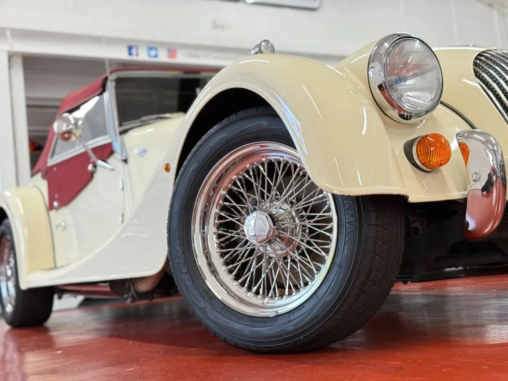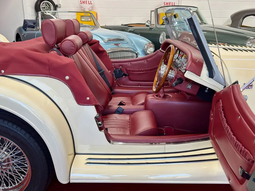 INTERIOR & EQUIPMENT - The luxurious extended Muirhead Mulberry leather upholstery is a gorgeous contrast to the Royal Ivory exterior paintwork. The supple leather presents in outstanding order. The folding/reclining sports seats with optional leather neck rolls show no signs of any adverse wear, matching leather door cards with elasticated door pockets, Muirhead leather trimmed centre console, coin tray, steering column cowl, dash top, gear and handbrake gaiters all in perfect order and unmarked. The original Mulberry carpets piped to match are in excellent order and unmarked. The Walnut gloss dash facia is flawless with no marks, cracking or lifting. All interior lighting, Smiths gauges, switches and electrics work as they were intended and optional chrome interior mirror. Fitted with a premium Pioneer MOSFET 4 x 50W CD/Radio RDS/WMA/MP3 sound system. Stainless steel door hinges and gear knob, 12v socket, adjustable height steering, Mulberry 3-zip Mohair full tonneau cover, organ pedal accelerator. Moto-Lita 3-spoke wood rim MK3 offset sports steering wheel, designed to give more leg room when entering and exiting the vehicle, plus improved instrument visibility, mounted on a Mota-Lita billet 9-hole boss with embossed Morgan logo... Simply perfect. - EXTERIOR - Finished in factory Royal Ivory paintwork and supports a brilliant, uniform deep gloss shine throughout. All original panels are perfectly straight, totally corrosion-free and gaps as per it left the factory all complemented with contrasting black wing piping. All original lights front and rear are in exceptional order with uniform colour and a silky polished finish. Optional front and rear chrome overriders, optional stainless steel rear luggage rack with screen storage, stainless steel mesh grille, twin round door mirrors, locking door handles, high-level brake light, Lemans style locking filler cap, stainless badge bar, Union Jack badges and wing top sidelights. Unmarked Mulberry Mohair deluxe hood pack with crystal clear rear screen. attached to a stainless steel hood frame. Matching unmarked Mohair sides screens that store neatly in a Mohair zip bag with central divider for screen protection and embroidered with the Morgan logo in gold. The screen bag stows away securely on the luggage rack... STANDARD EQUIPMENT - Heater, Heated Screen, Tool Kit, 12v Socket, LeMans Style Locking Filler Cap, Smiths Gauges Displaying Oil Pressure, Water Temperature And Fuel, Centre Mounted Rev Counter, Offset Speedometer, Twin Side Mirrors, Glove Box, 3-Speed Wipers. - ADDITIONAL EQUIPMENT - Muirhead Mulberry Leather - £1550, Elasticated Door Pockets - £400, Mohair Deluxe Hood Pack With Stainless Hood Frame - £1560, Stainless Deep Dish Wire Wheels - £1290, Walnut Dashboard - £400, Moto-Lita Steering Wheel And Boss - £280, Chrome Interior Mirror - £45, Morgan Ali Tax Disc Holder - £20, Folding/Reclining Sports Seats - £465, Pioneer CD/Radio Sound System - £495, 3 Zip Mohair Tonneau Cover, Sidescreen Bag - £569, Union Jack Badges - £55, Elasticated Door Pockets - £310, Organ Peddle Accelerator - £75, Stainless Mesh Grille - £125, Leather Covered Steering Cowl - £199, Side Lights - £295, Chrome Overriders - £1750, Morgan Neck Rolls - £220, Stainless Luggage Rack With Screen Storage - £357, Polished Stainless Badge Bar - £72, Extra Tread Rubbers - £70, Stainless Wiper Arms - £165, Muirhead Leather Console Tray - £95, Leather Bonnet Strap - £205. - WHEELS, TYRES & BRAKES - Wheels - Five unmarked 15" stainless 70 spoke centre laced wire wheels 6J x 15 with chrome continental style octagonal spinners and spanner. Tyres - All matching brand new Yokohama 195/60 R15 tyres. Brakes - Caparo 4-pot front calipers and discs, rear drums. - ENGINE & TRANSMISSION - Fitted with the fast revving Ford Duratec double overhead camshaft, 1999cc engine, max power: 145 bhp@ 6000 rpm, max torque: 140 lb-ft. at 4500 rpm, 0.60 in 7.0 seconds. On the road, power is linear and smooth, the proven 5-speed gearbox is slick in operation, the clutch is very light and progressive. The engine and engine bay are detailed to show standard. Driving this Plus 4 is simply a joy, 877kg, nible and sounds fantastic courtesy of the full stainless steel exhaust system... SUMMARY - Here we have a chance to own a very desirable Morgan Plus 4, in the wonderful colour combination of Royal Ivory coachwork, Muirhead Mulberry leather with a Mohair Mulberry hood and side screens. This Plus 4 was registered new to Mr Tim Willies on the 1st October 2010 by Morgan Main Dealers, Allon White Sports Cars, Cranfield, Bedfordshire. Mr Willies cherished the car until August 2016. The car was then sold to second owners, the Carson family who sold the car to the current keeper in January 2024. The history file contains the original Morgan black embroidered wallet with Owners Handbook, original order form, original bill of sale with options list, fully documented service history with 14 stamps of which 13 are official Morgan Dealers, every MOT since the first on 4th October 2013 at 5474 miles, 3 sets of original keys, sidescreen locking bar, plus receipts and invoices for thousands of pounds worth of servicing, maintenance and upgrades. This detailed documentation proves the genuine low mileage. Servicing supported by original invoices - 28.1.2011 - 922 Miles - Allon White Sports Cars - 26.9.2011 - 2339 Miles - Allon White Sports Cars - 28.9.2012 - 3925 Miles - Techniques Morgan - 4.10.2013 - 5472 Miles - Techniques Morgan - 3.10.2014 - 7322 Miles - Techniques Morgan - 9.10.2015 - 9151 Miles - Techniques Morgan - 26.8.2016 - 10602 Miles - Allon White Sports Cars - 19.8.2017 - 12274 Miles - Allon White Sports Cars - 16.8.2018 - 13487 Miles - Allon White Sports Cars - 28.8.2019 - 14939 Miles - Allon White Sports Cars - 23.2.2021 - 17005 Miles - Allon White Sports Cars - 24.2.2022 - 18917 Miles - Allon White Sports Cars - 24.2.2023 - 21449 Miles - Allon White Sports Cars - 18.6.2024 - 23