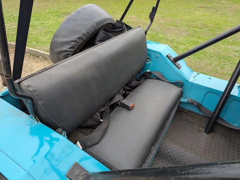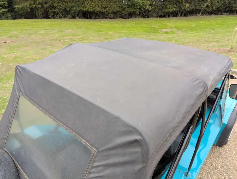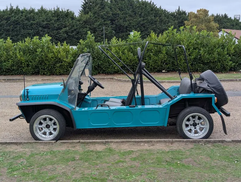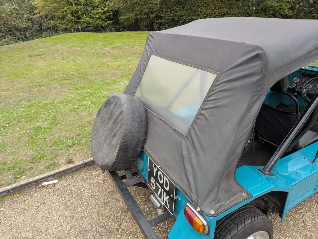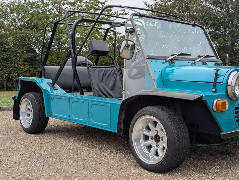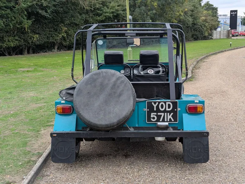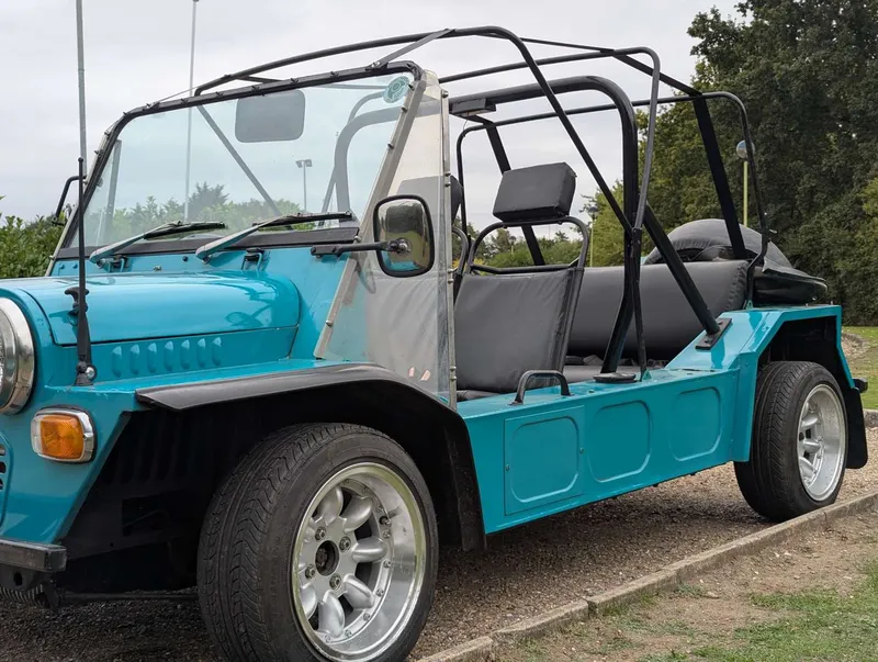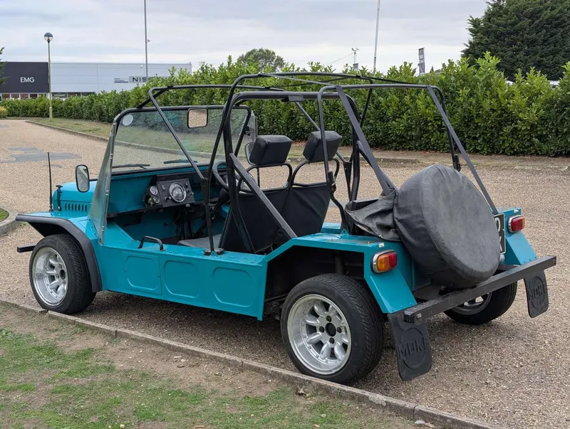 This turquoise Morris Mini Moke was imported from Australia in 2016. It comes with the latest V5C and an invoice showing that its alternator and ignition components were renewed last year. The car has been with the same owner for 9 years and has had only two keepers in the UK, the first being the importer. It was first registered on 1st January 1972, and the indicated mileage is 95,546.According to the V5C this Moke has a 988cc engine, but its engine number (10YFUH8860) corresponds to a 1098cc A-series unit. Not specified