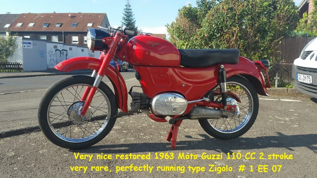 A VERY nicely restored 1963 Moto Guzzi Zigolo. With a 100CC 2 stroke engine. VERY rare, perfectly running. Big choice in bikes and mopeds in ''''the Stolze Collection''''!