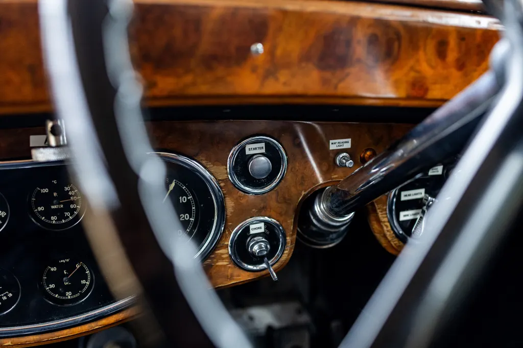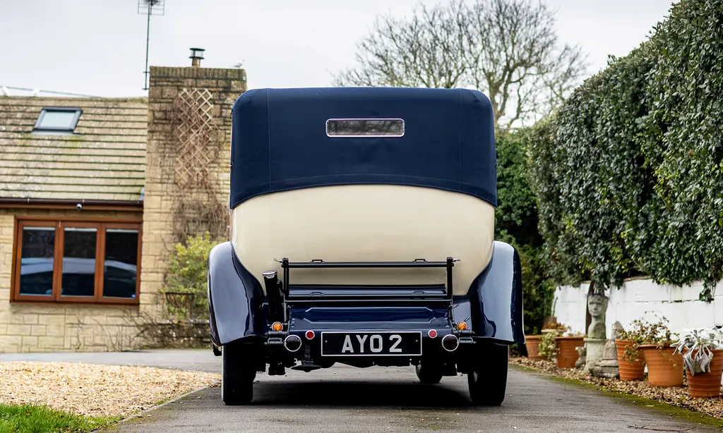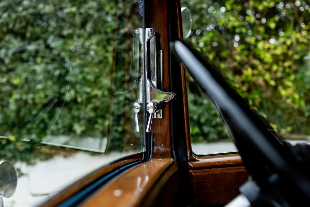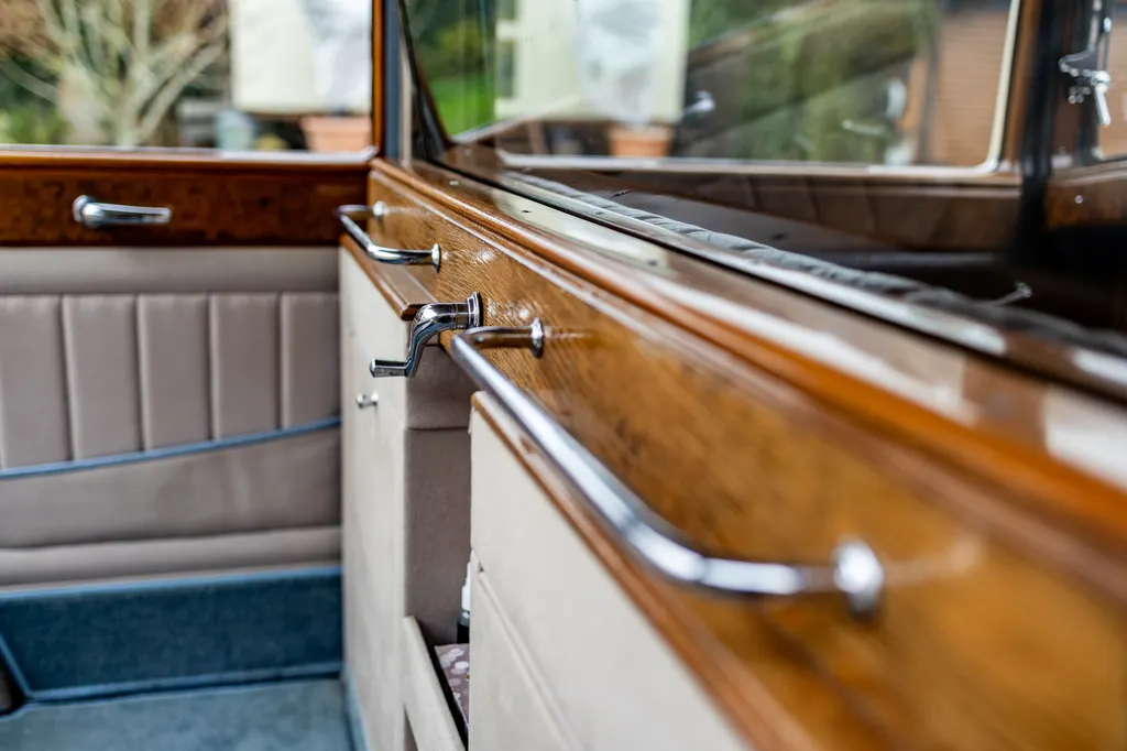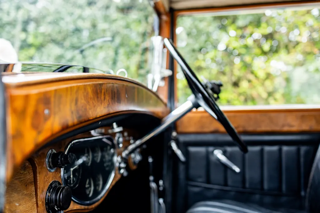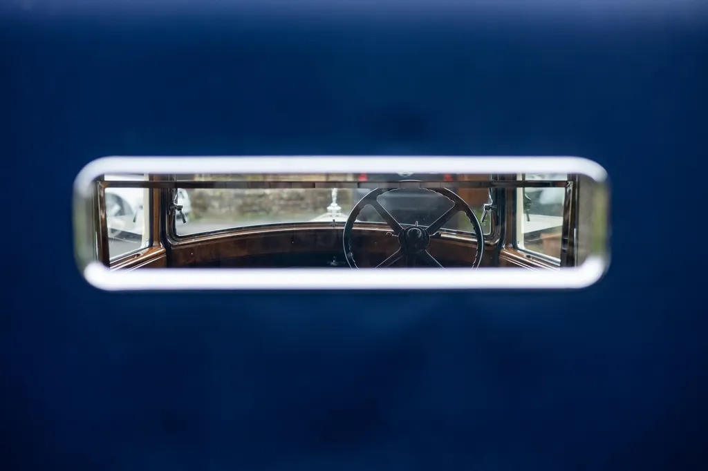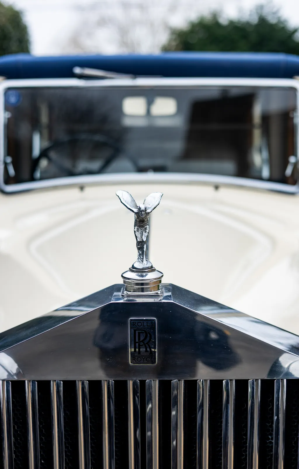 This handsome Landaulette by Barker is presented in cream over Midnight Blue, but its worth mentioning that the cream wrap could be removed to reveal its original colour beneath if one wishes to do so. Its wonderful interior is presented in West of England cloth to the rear, including the two occasional seats and has dark blue leather to the front, providing a nice combination, with black carpets and over rug to finish it off nicely. This Rolls-Royce had spent 25 years in the USA in the famous James C Leake collection. James Leake owned one of the world's largest collections of Rolls-Royce automobiles and founded The Antiques Inc, a museum of classic and vintage cars in Muskogee. He also served as chairman of the International Automobile Hall of Fame. The car has powder coated wire wheels (originally were stainless steel), Lucas driving lights and has a wind-up glass division for privacy. Its body was restored in 2005 by Doug Nixon, and the engine was fully rebuilt in 1998 by Sargeants Of Goudhurst who installed a new high aspect rear diff and the roof was professionally replaced using quality Mercedes-Benz materials. It was rewired in correct colour coded cable provided by Ristes, proper leather gators were fitted, and period style indicators were also fitted. The present owner has had the starter motor refurbished and renewed the clutch. The car has won several awards over the years including best in show at the prestigious Concours D'elegance at Sarlat in 2011. There are copies of photos of the car in the history file showing what the car looked like originally and obviously the Landaulette can be transformed back to its original look at any time. Consigned by James Good