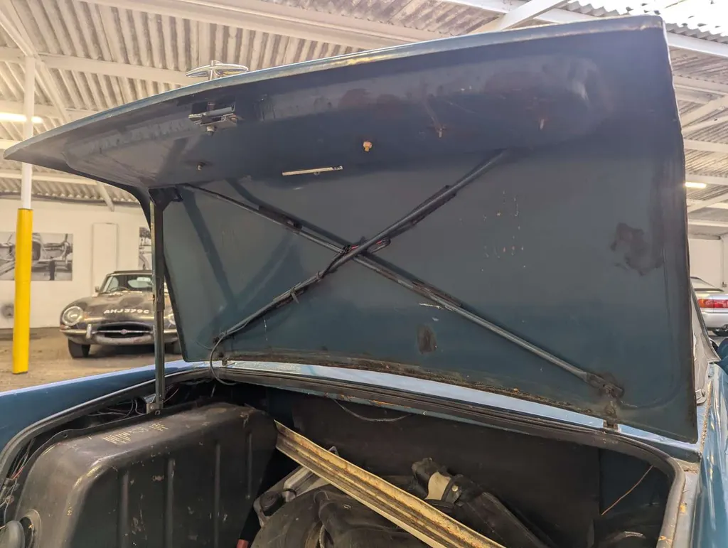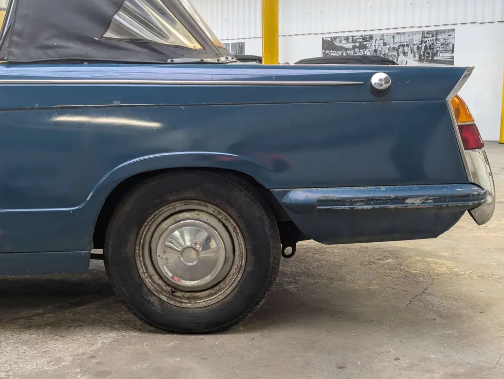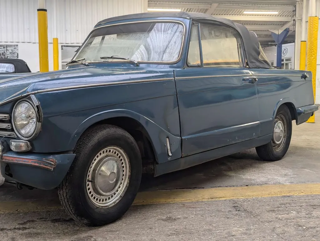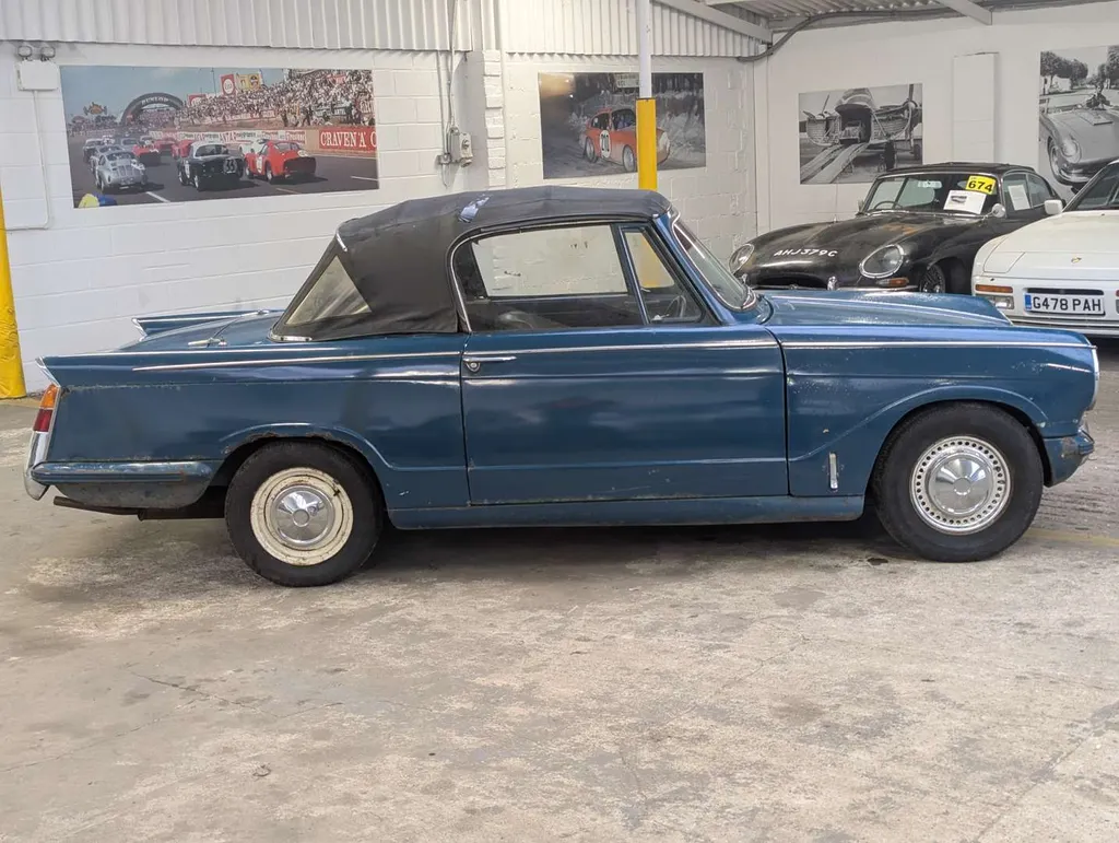 This blue Triumph Herald has been registered to the same keeper since 1983, dry-stored unused for at least 36 years. The engine turns and the car rolls easily for loading, but it will require a new coolant pump as this is seized. The belt was cut to check the engine turns freely.Great chance to restore a correct C.V. chassis numbered 13/60 Herald convertible or recommission and use as-is, with some parts in the boot to help you on the way. The history folder contains MoTs going back to 1977, old-style V5 which remains current, sundry invoices and a Haynes workshop manual.The odometer shows 73,825 miles, and the car was first registered on 1st September 1971. Not specified