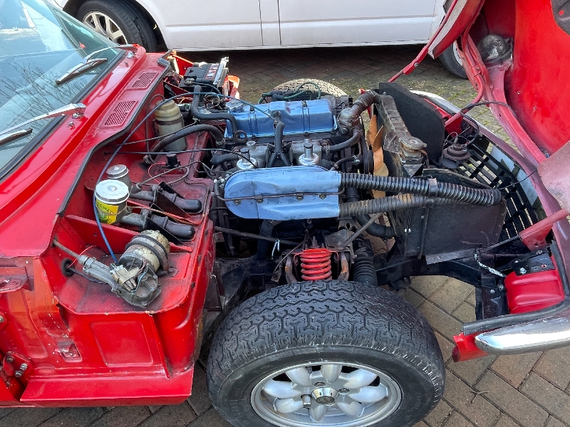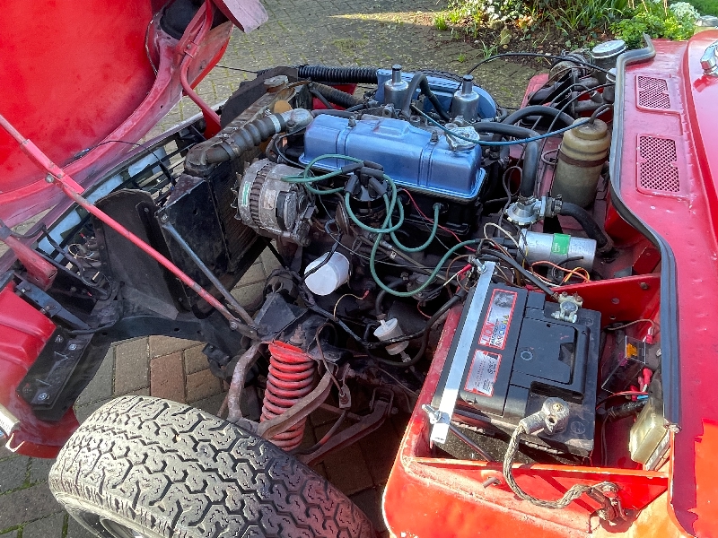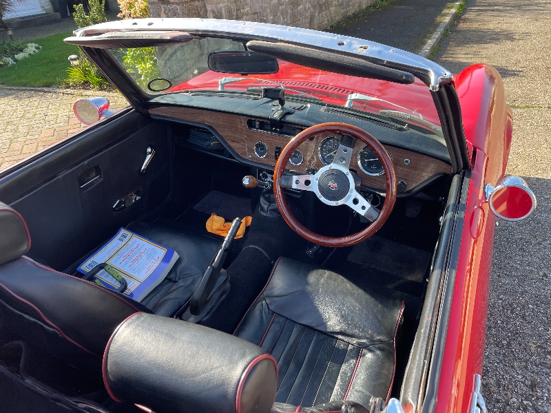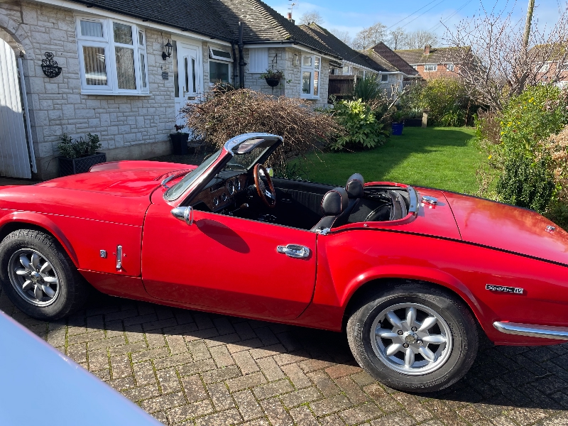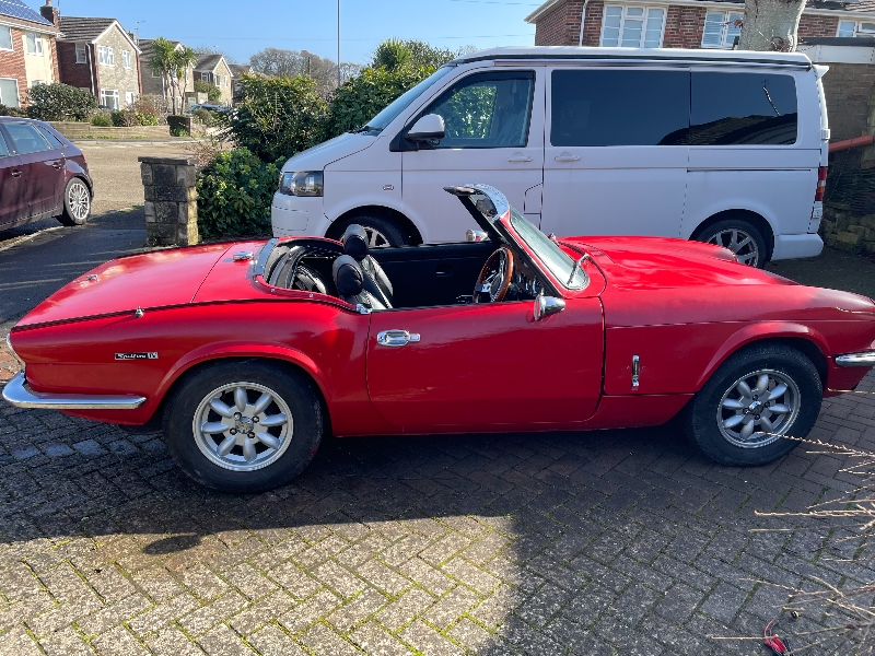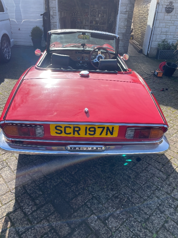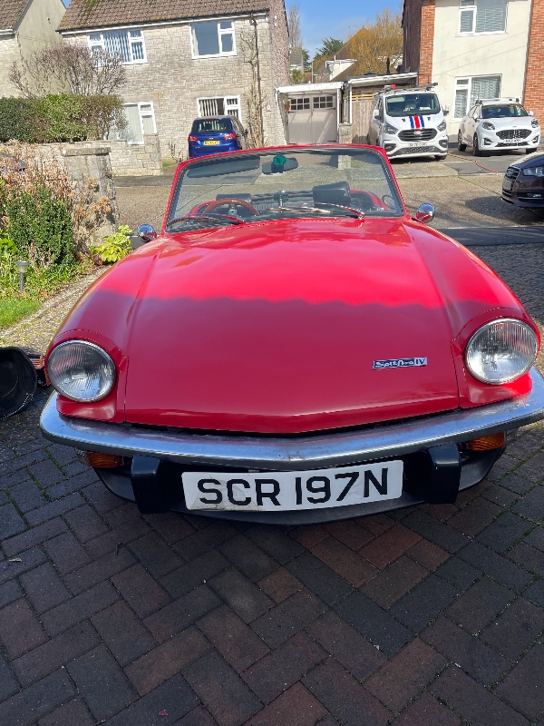 1974 Triumph Spitfire Mk4 1300, Mileage 90000 miles, this car was recently resprayed all over in classic Rover Red (32), and clear laquer, to tidy up a poor paint finish. The underside is in Red body colour with black chassis rails. All box sections treated with Dinitrol ML wax penetrator. The 1300cc engine features Accuspark electronic ignition, with new distrubutor cap , leads and plugs. The carburettors have been overhauled with SU kit, and new heat shield fitted. A new starter motor has been fitted. The brakes have been overhauled and DOT 5 silicon brake fluid used. The car features a new soft top, and has Minilite wheels. The front and rear bumpers are pitted with holes, so new bumpers will be required to finish off the refurbishment. The car is over 40 years old , so doesn't require an MoT. The car is being sold due to lack of use. This car provides a reliable starter classic. Please contact with sensible offers.