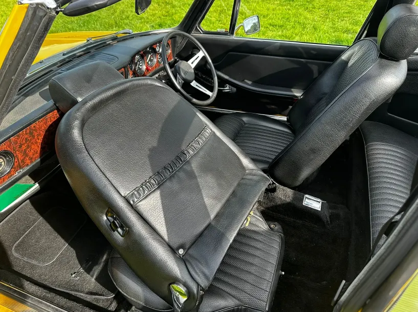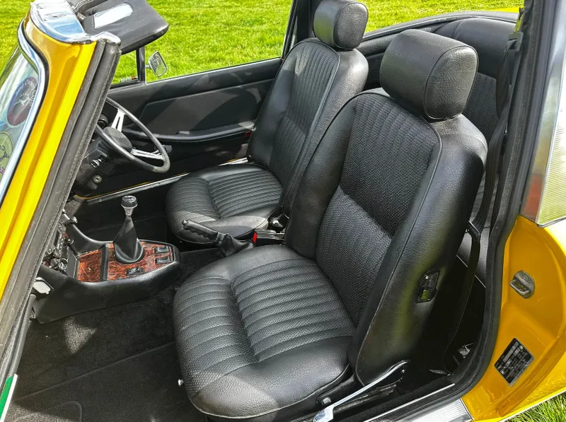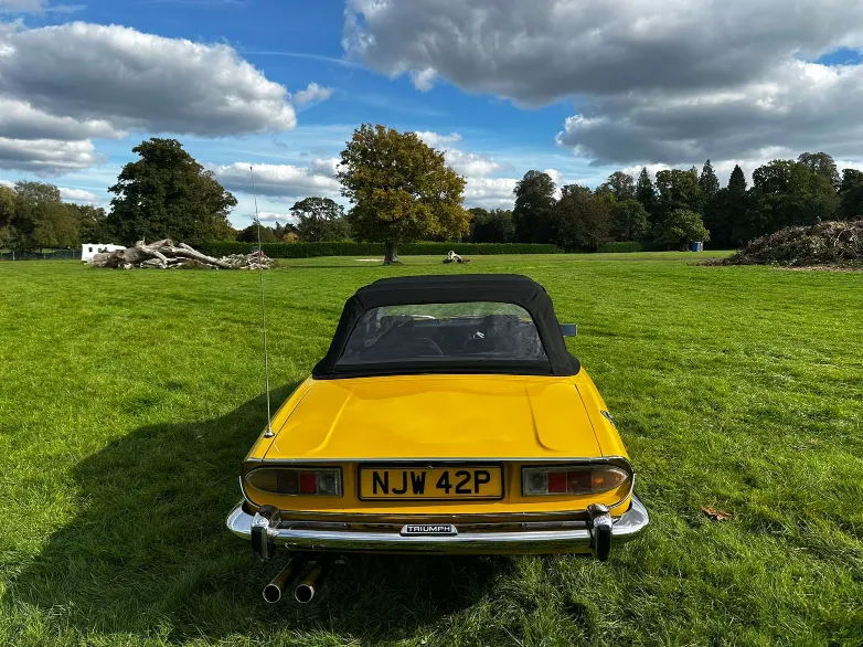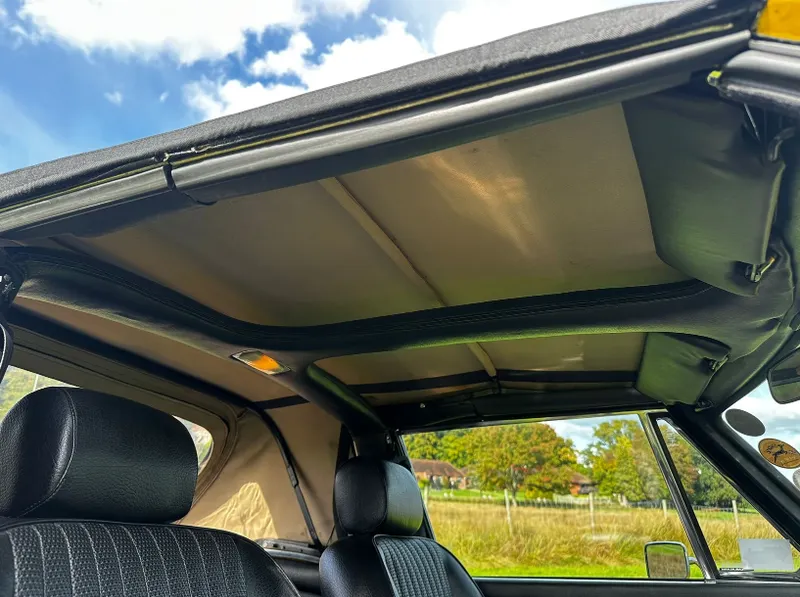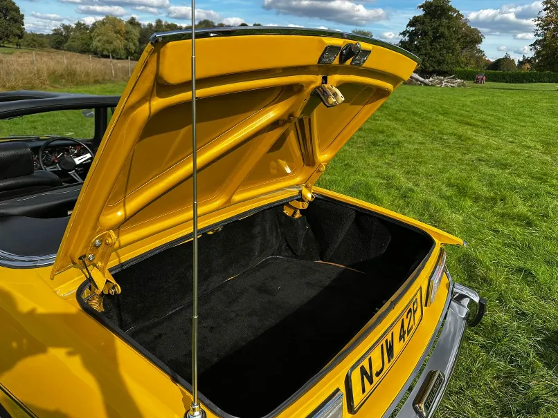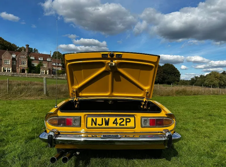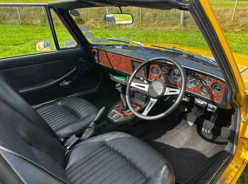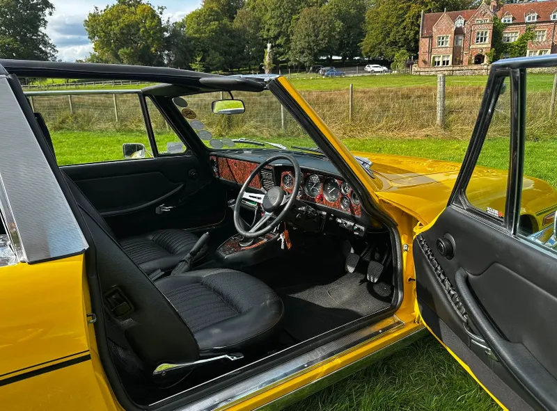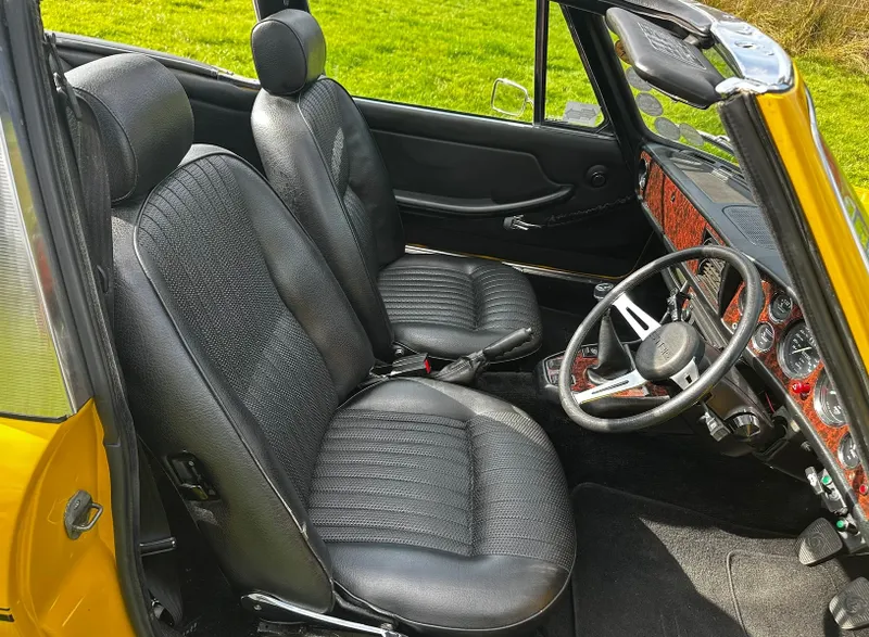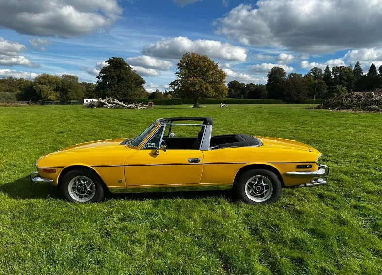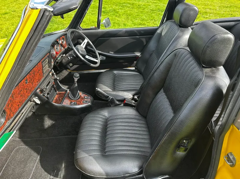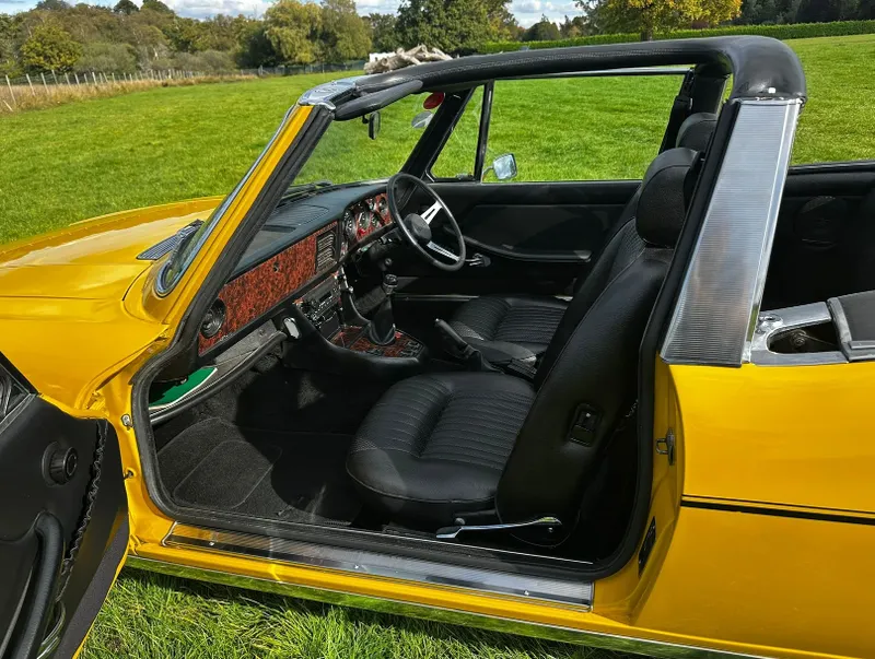 1975 Triumph Stag 3.0 V8. First registered 10.11.1975. Finished in Inca Yellow over Black Vinyl interior, this Stag looks superb from every angle. It has been upgraded with Weber carburettor, electronic fuel pump and Ignition, Stainless Steel Bumpers. CV Joints have also been upgraded along with driveshafts. The engine has been fully rebuilt and the bodywork was restored by Ward. This Triumph has been meticulously looked after. It is in lovely condition throughout and the soft top is like new. With 80 thousand miles showing, this is believed to be genuine as the paperwork consists of lots of old MOT certificates dating back to the late 80s, which verifies the mileage. Other paperwork includes Heritage Certificate, Invoices, Pictures, Current V5 etc. It is the perfect example for any collector or enthusiast. For any further information or to arrange a viewing, contact our sales department on 01425489575 or sales@classicconnection.co.uk. £23,995 any inspection welcome and delivery available.