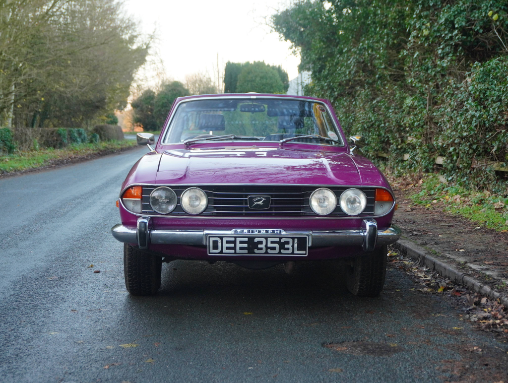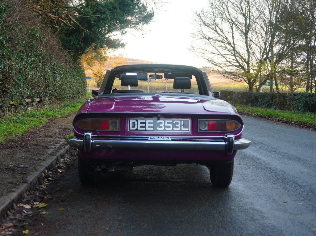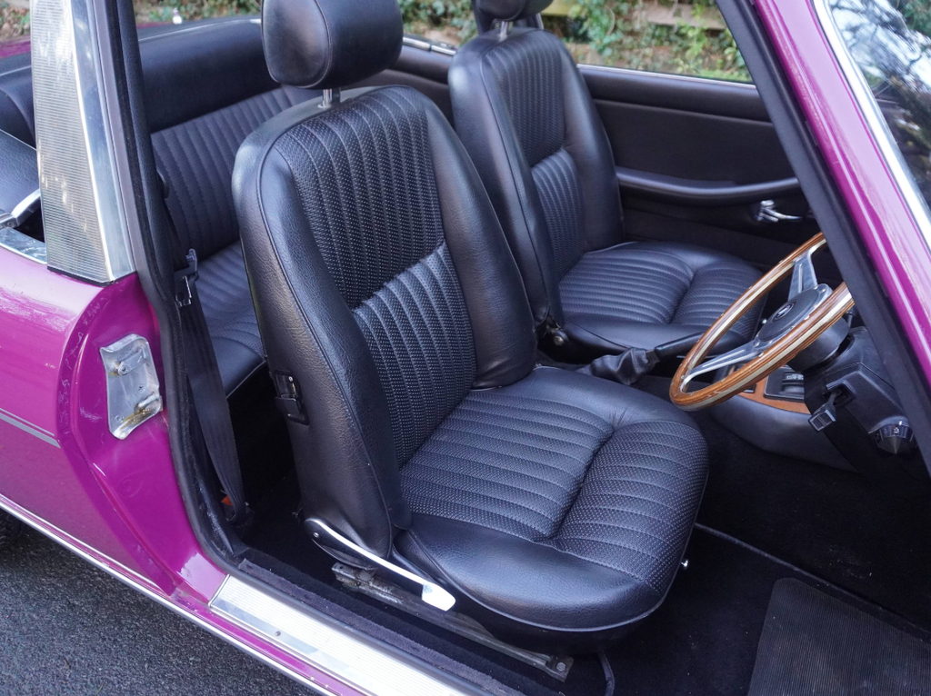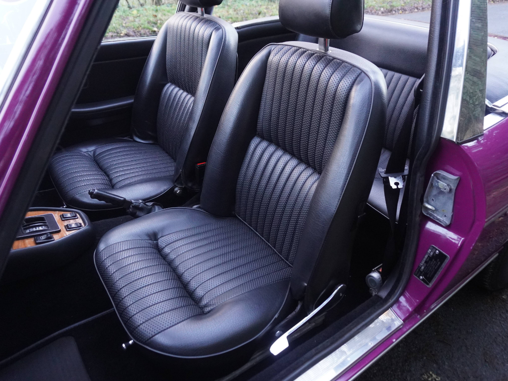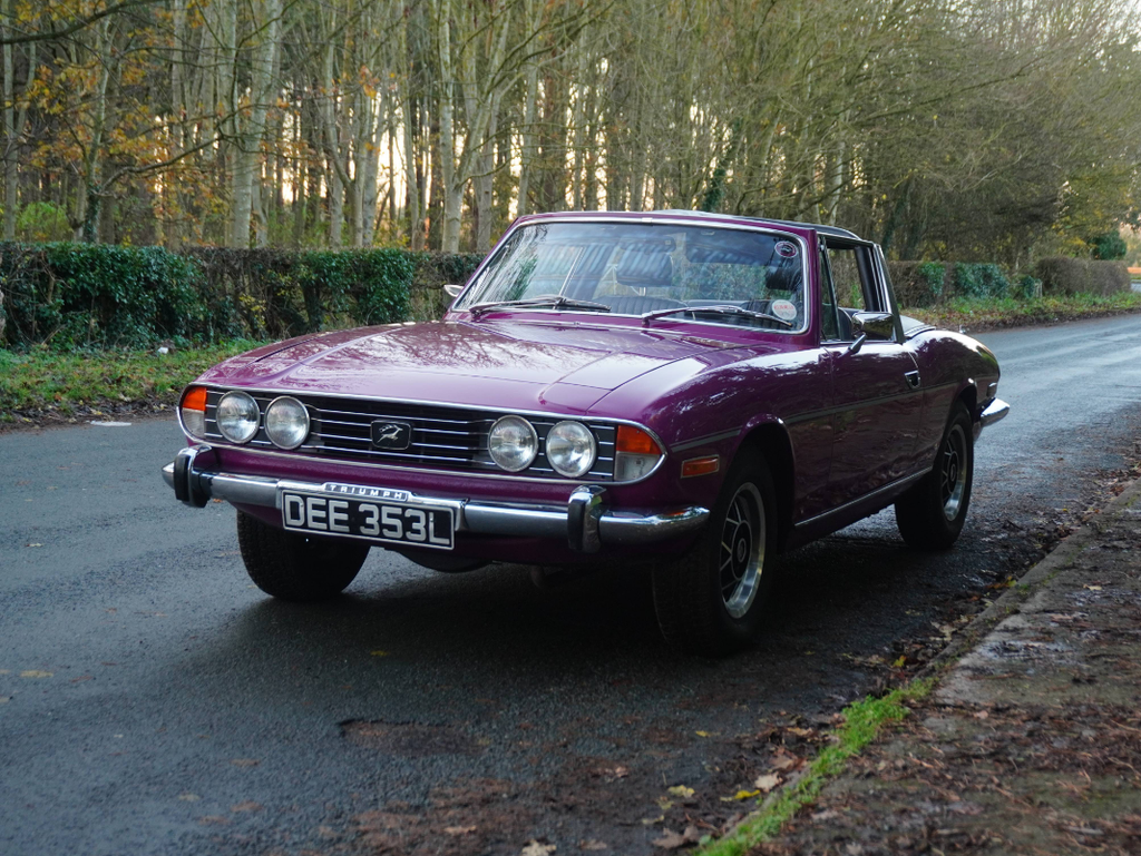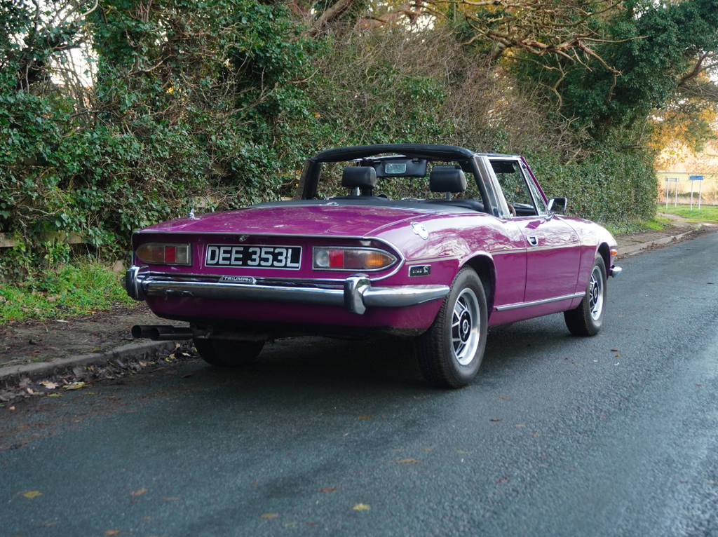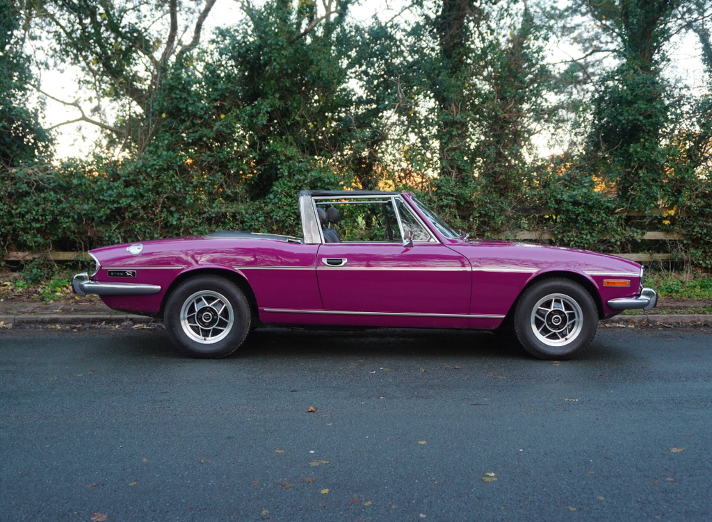 This very well presented, incredibly usable Triumph Stag has come to us in part exchange from a regular customer in Worcestershire. Finished in its correct Triumph colour of Magenta with lovely Black upholstery and correct Rostyle wheels, the Stag has arrived with us completely on the button and driving superbly. First registered in June 1973, this Automatic example has led a very sheltered life. For many years the car was in warmer climates. The Arboleas region of Spain. As result, the car is structurally excellent, and it clearly demonstrates a high level of originality. The Giovanni Michelotti designed bodywork draped in the beautiful bright shade of Magenta has an outstanding curb appeal. Complimented well with a beautifully re-trimmed upholstery and new mohair soft top hood, the Stag offers a very enjoyable open top motoring experience. The Triumphs well-serviced 2997cc V8 engine pulls strongly with enhanced performance from the Weber carburettor and the Borg-Warner Model 35Gearbox transitions smoothly through the gears. Performing in very impressive condition, DEE 353L epitomises the design brief of a stunning British grand tourer. Accompanying the Triumph is a comprehensive history file full of hundreds of invoices from the Triumph Parts specialists Rimmer Brothers detailing meticulous maintenance throughout the last 25 years. Most recently, the Stag has benefited from a thorough strip, clean, and tune of the Weber 38 DGMS carburettor, new cam cover gaskets, a brake master cylinder overhaul, an ignition service and engine service. This is a very strong car, it's proven reliable, drives incredibly well and is ideal for regular use, long distance touring and historic events, shows and car runs.