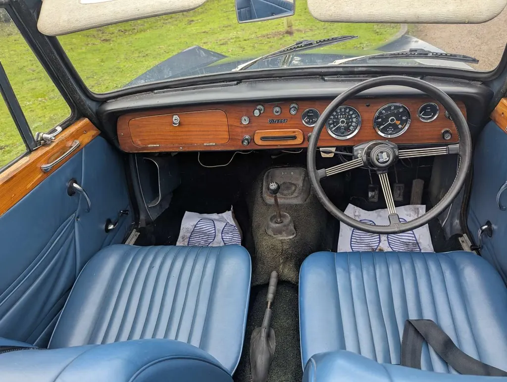 This blue Triumph Vitesse convertible has had only two registered keepers from new, both in the same family. Its history file includes the original buff logbook, showing that it was first registered on 12th February 1968 to its first owner in Kent. In 1995 the car was passed on to his son, who used it until 2005. It was then put into storage until passing through our August 2024 auction, where it was purchased by our vendor. Under his ownership it has been recommissioned and put back on the road.The car comes with a good collection of receipts for parts and maintenance, some dating back to the early 1980s, old V5, latest V5C and MoT certificates from the 1980s, and original handbook. A service logbook records the car's first 10 services up to 71,844 miles in 1989. Today the odometer is showing 75,630.Also present are a spare lock barrel and keys, a few old photos of the car, and a good collection of relevant manuals. Not specified